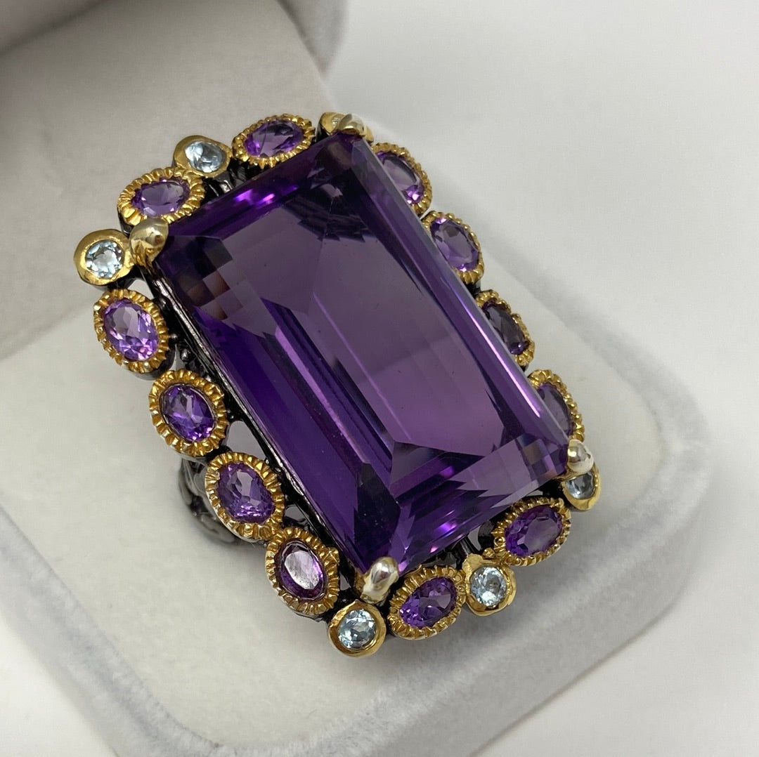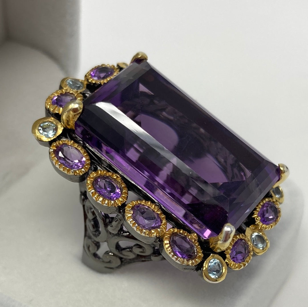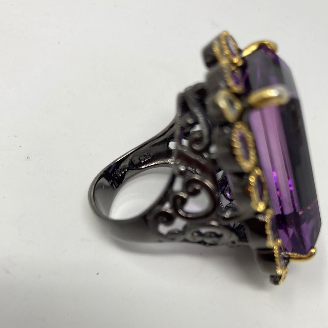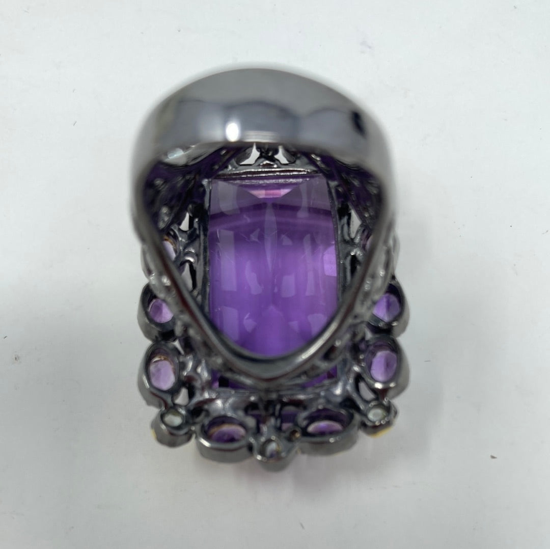 We A masterpiece, a super special, highly desirable faceted Emerald cut genuine gemstone. This is a fine quality genuine Amethyst of 40+ CTW, a rate find. It’s a custom made setting, one of a kind made for this Amethyst 26mm by 16mm specimen. It’s a once in a lifetime find, set in .925 sterling silver with a Rhodium overlay with accents of yellow gold. Notice the attention to detail with the elegant reticulated setting. Encrusted with smaller oval faceted genuine Amethysts. Size 6 1/2