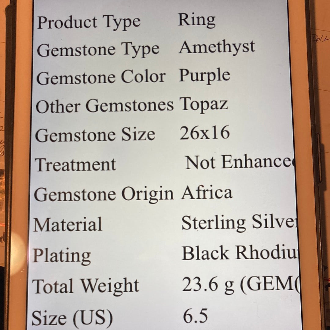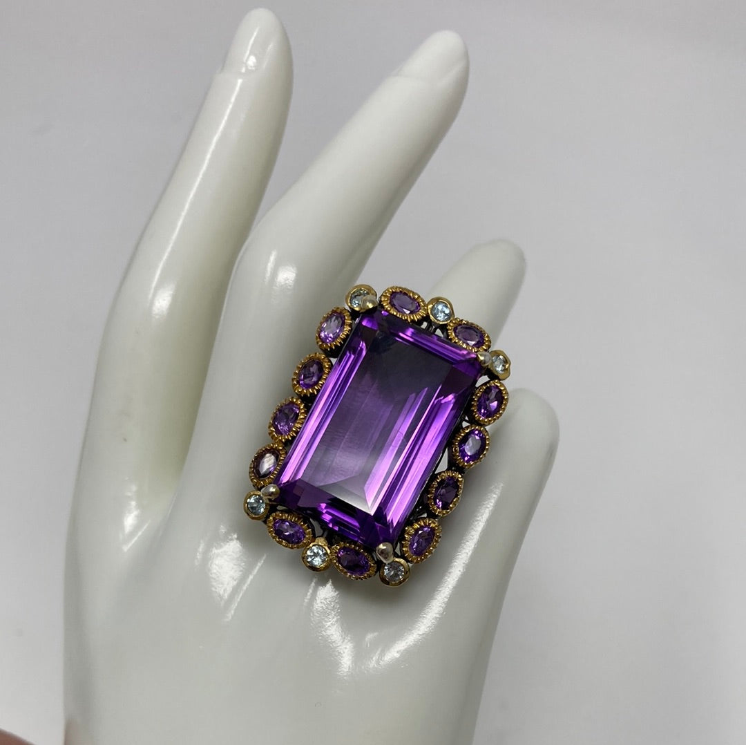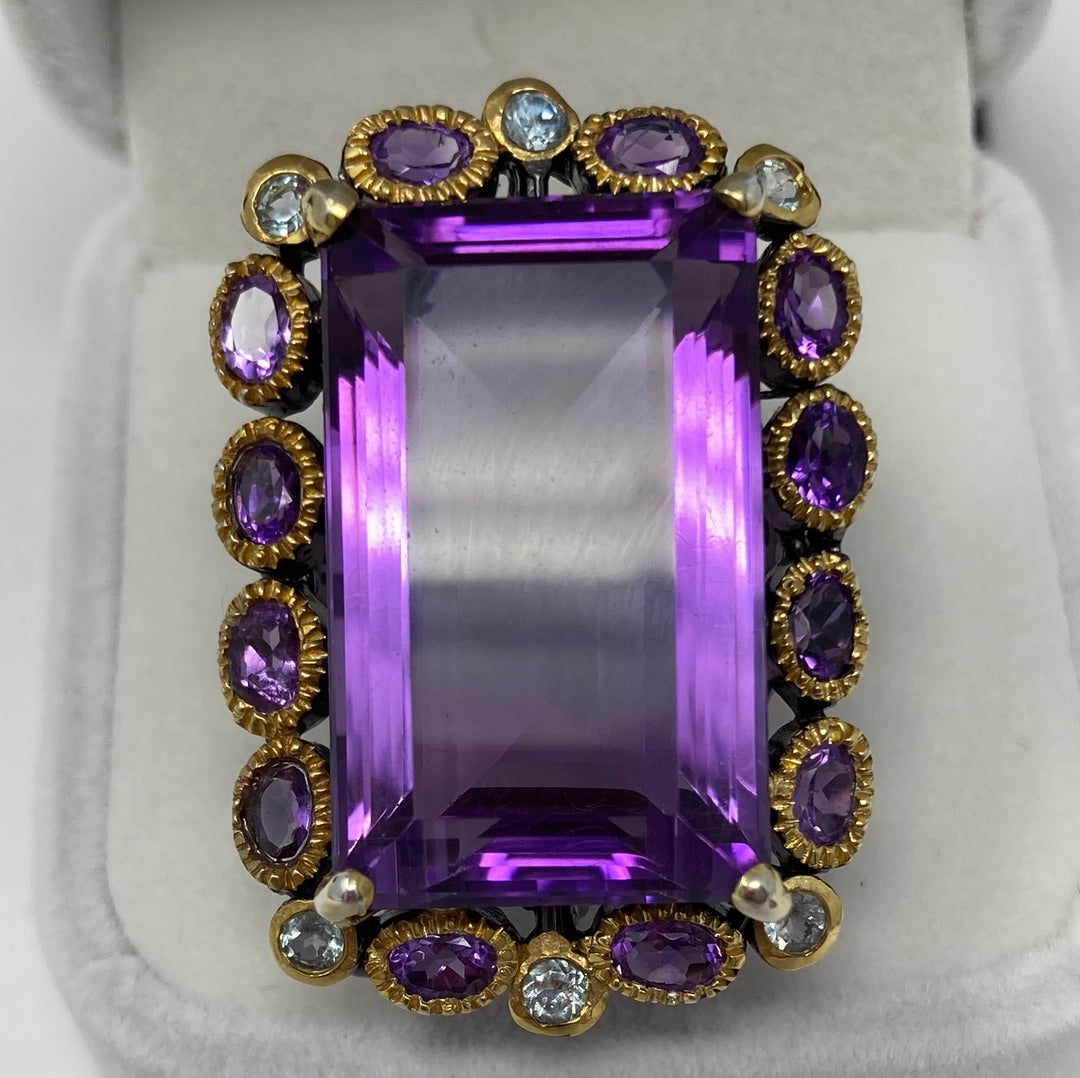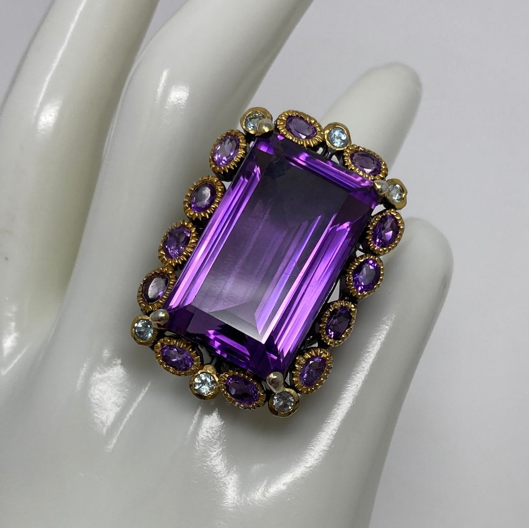 We A masterpiece, a super special, highly desirable faceted Emerald cut genuine gemstone. This is a fine quality genuine Amethyst of 40+ CTW, a rate find. It’s a custom made setting, one of a kind made for this Amethyst 26mm by 16mm specimen. It’s a once in a lifetime find, set in .925 sterling silver with a Rhodium overlay with accents of yellow gold. Notice the attention to detail with the elegant reticulated setting. Encrusted with smaller oval faceted genuine Amethysts. Size 6 1/2