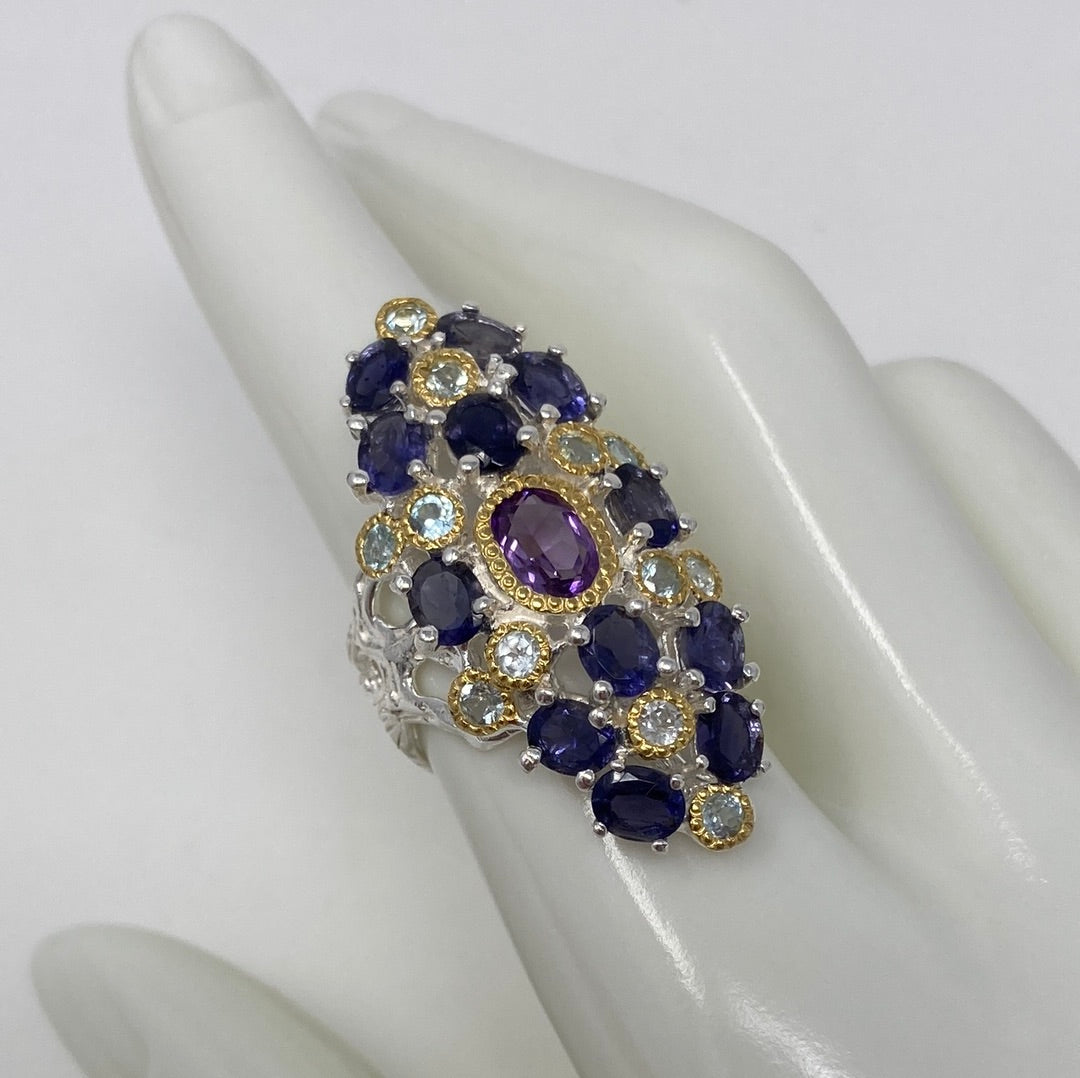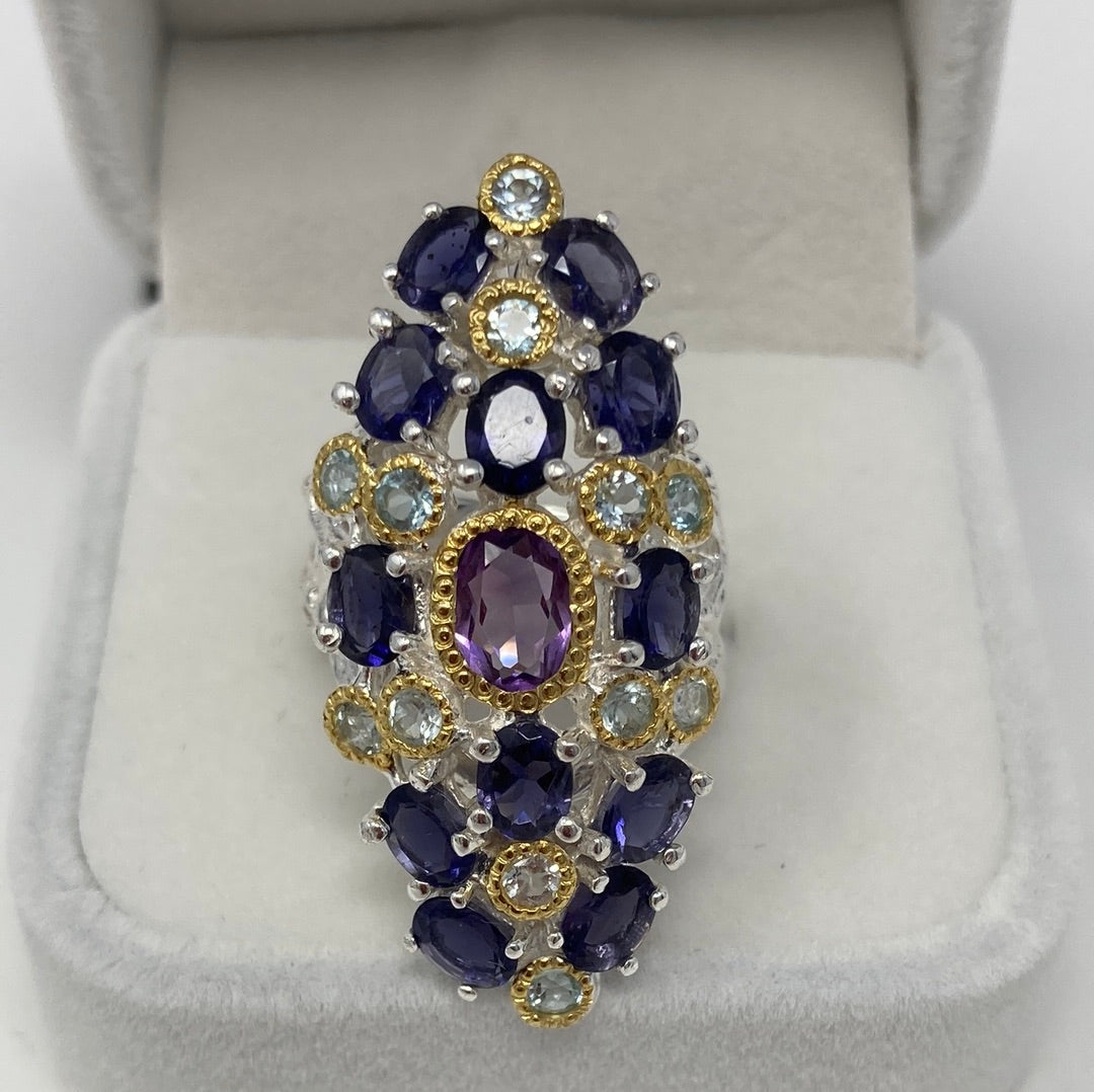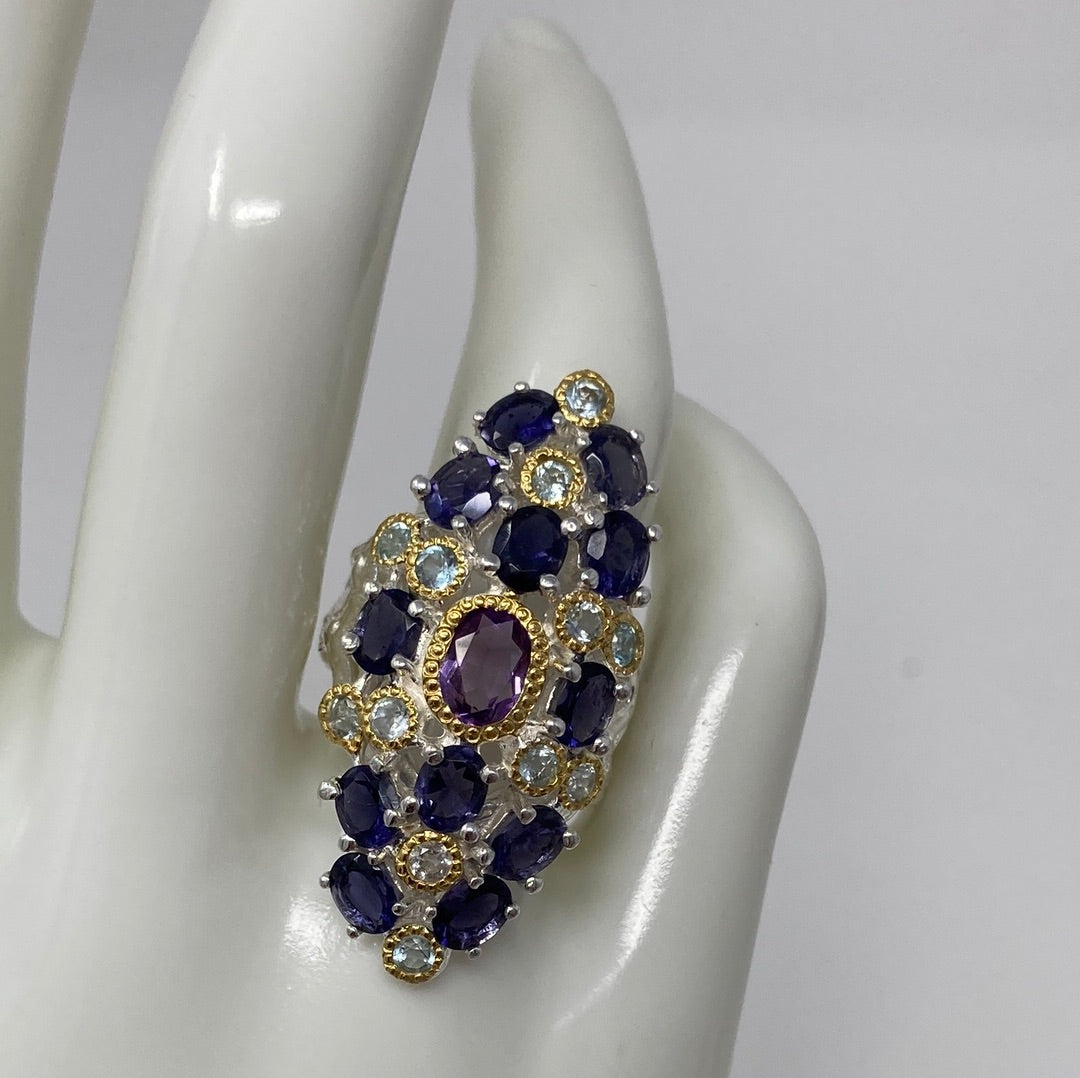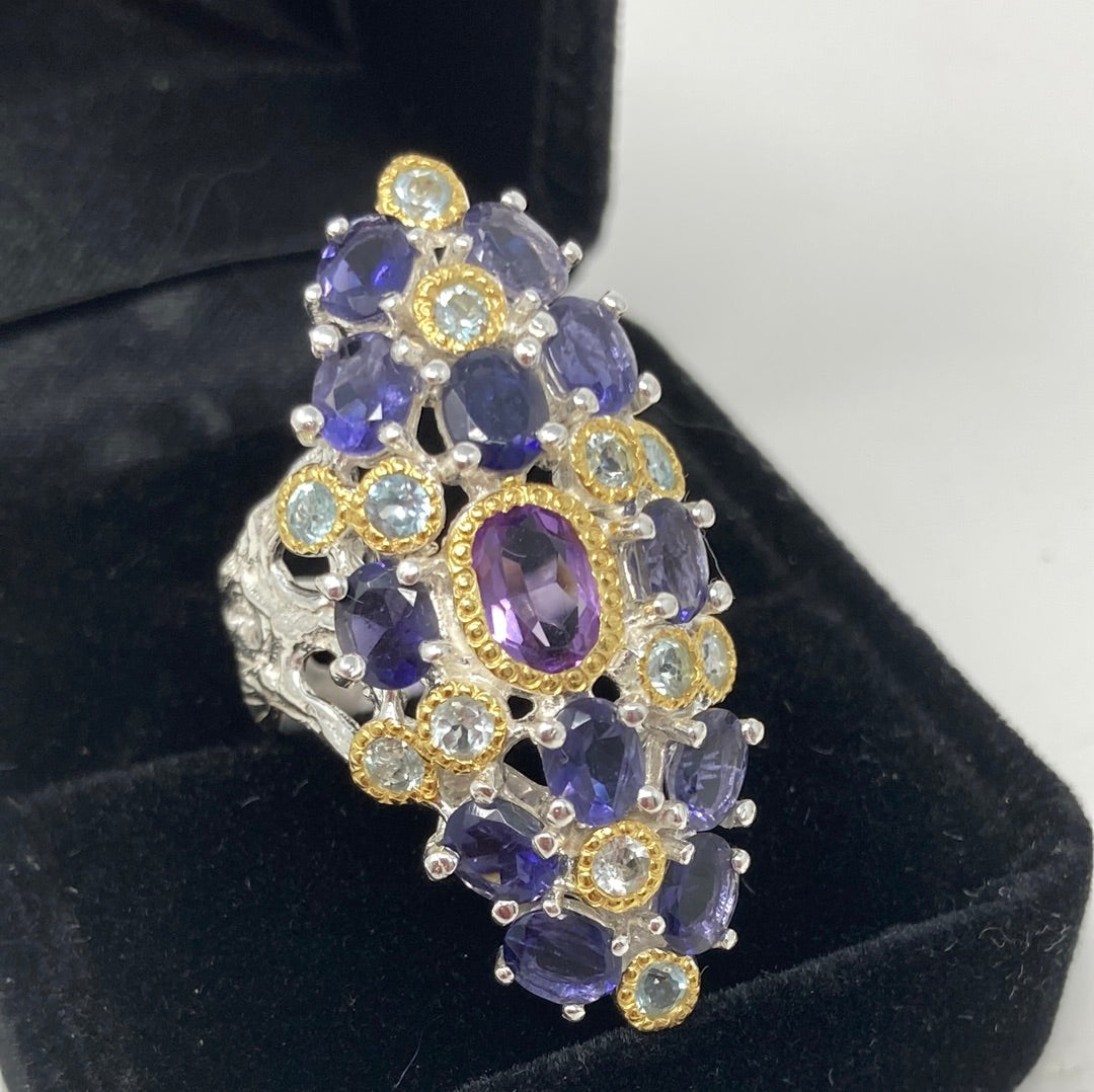 An exceptional work of art, genuine Amethysts and exquisite faceted Iolite. Intricate detailing and accented with pastel blue Topaz. The colors are just so intriguing and these gemstones increase in value over the years. This is a custom made, one of a kind masterpiece crafted in .925 sterling silver with accents of yellow gold. Size 6 1/2, Resize at your jeweler or use a ring guard 😘🎨❤️