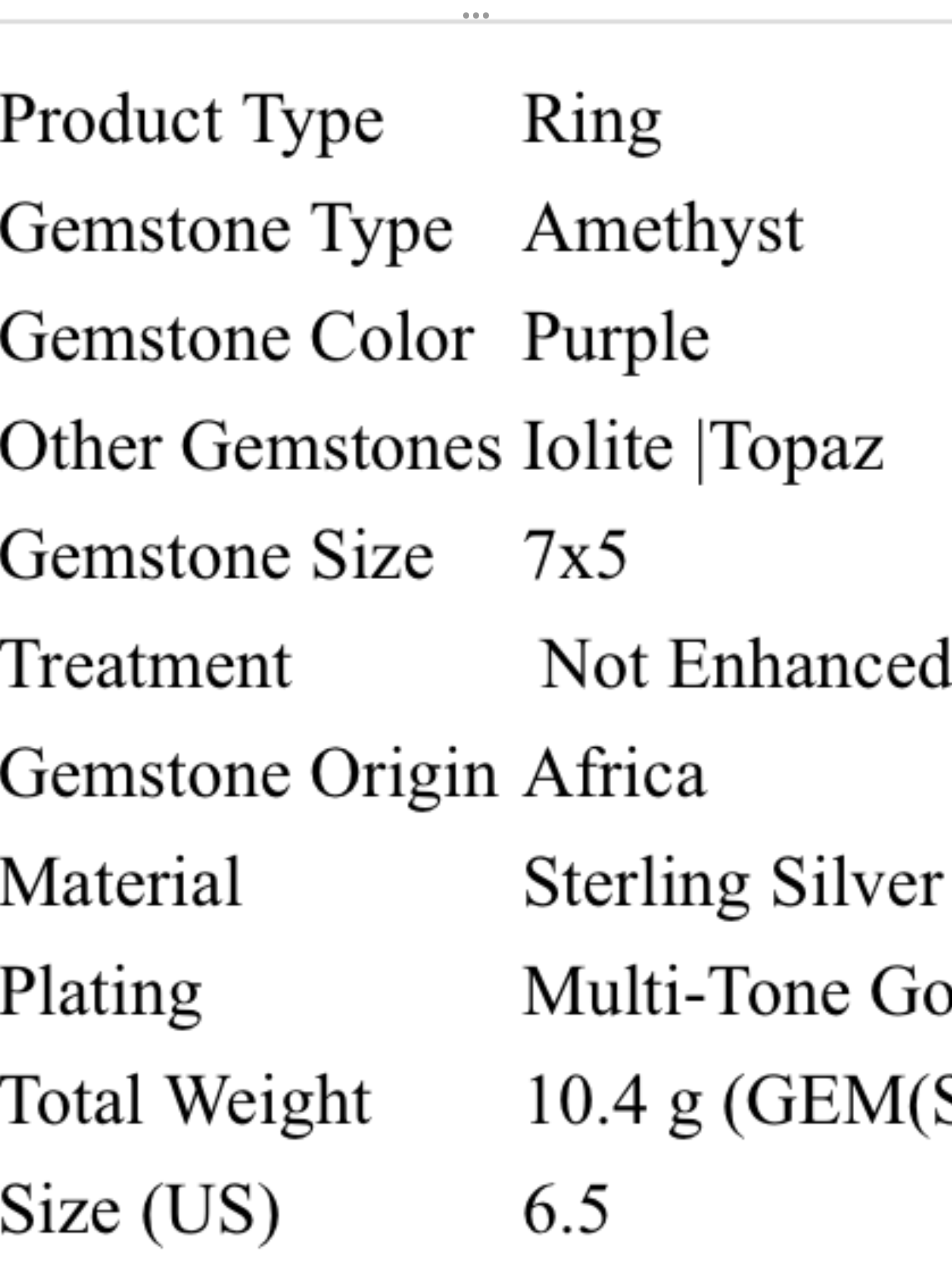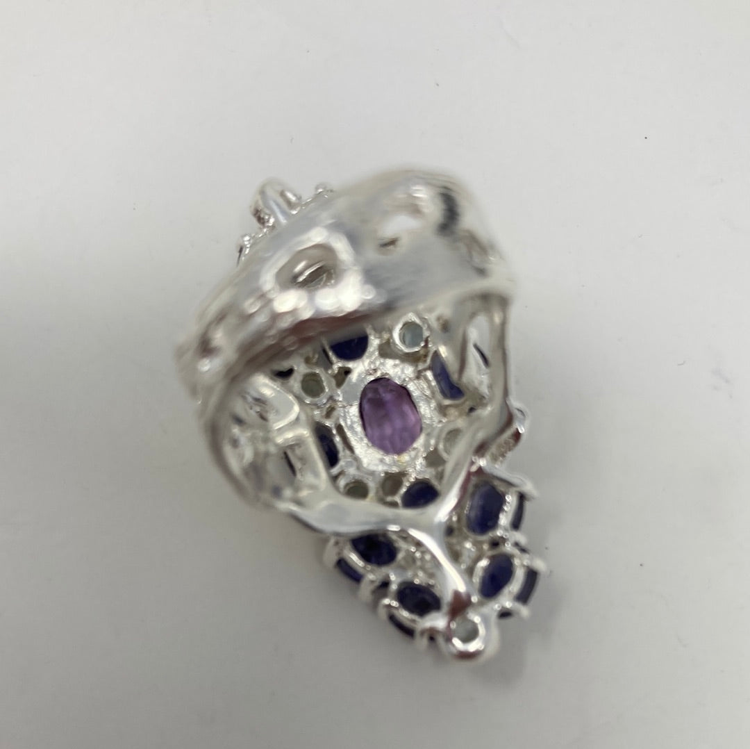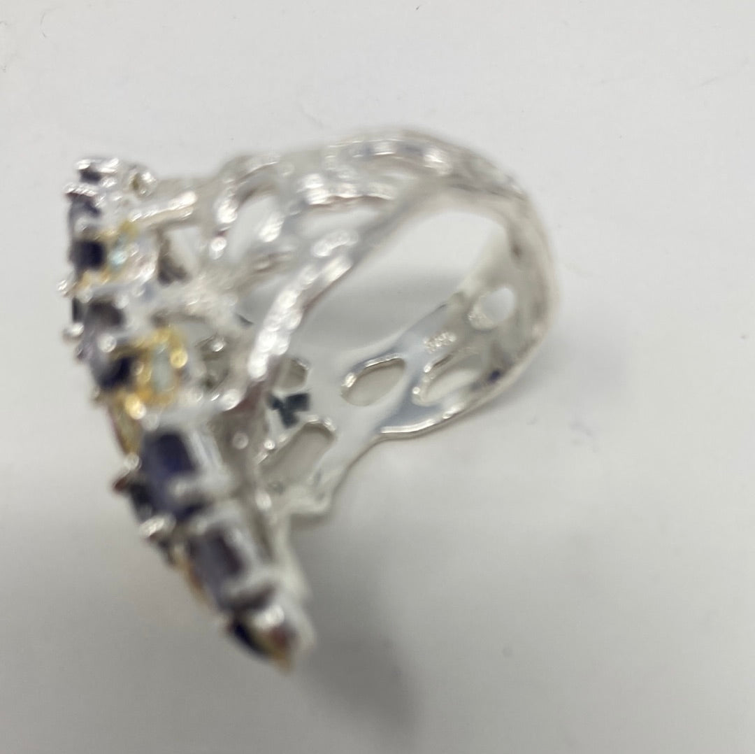 An exceptional work of art, genuine Amethysts and exquisite faceted Iolite. Intricate detailing and accented with pastel blue Topaz. The colors are just so intriguing and these gemstones increase in value over the years. This is a custom made, one of a kind masterpiece crafted in .925 sterling silver with accents of yellow gold. Size 6 1/2, Resize at your jeweler or use a ring guard 😘🎨❤️