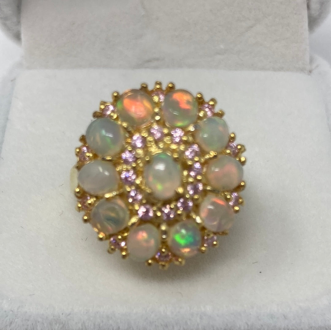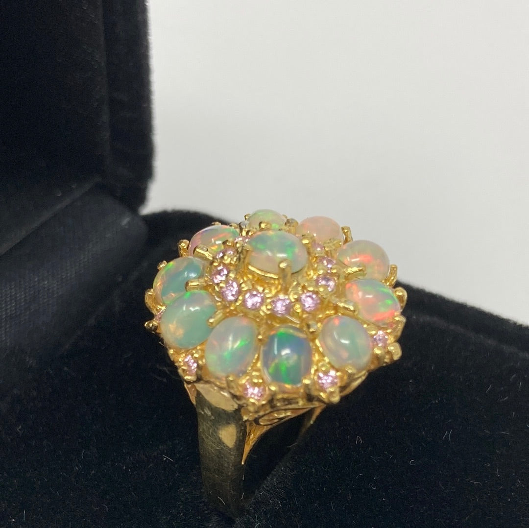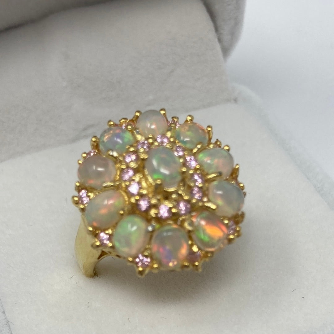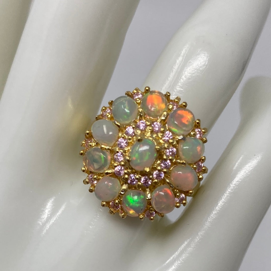 Wow, exceptional, genuine fiery Opals that explode with iridescent glowing fire. These natural gemstones are high quality and have selected for this custom made, one of a kind ring. Each gemstone measures 5mm by 4mm and is set in .925 sterling silver with a 14K yellow gold overlay. It is in a princess style setting that is timeless and elegant, sprinkled with tiny accent pink CZS. I only pick the best Opals with the most fire. Size 6 3/4 Resize at your jeweler or use a ring guard.