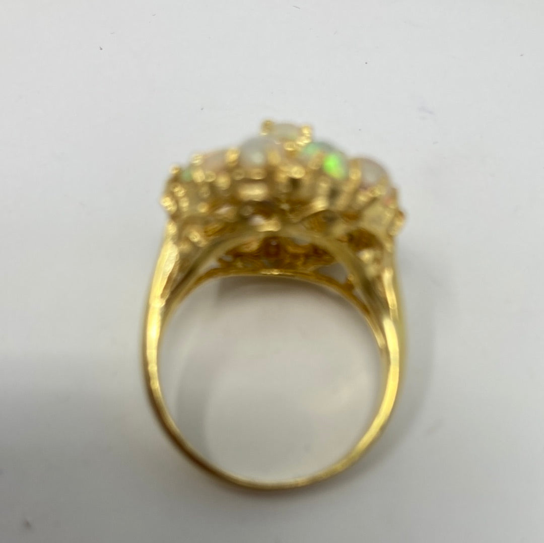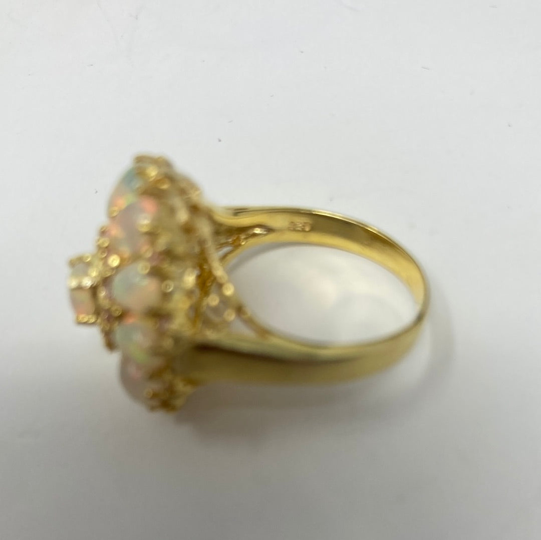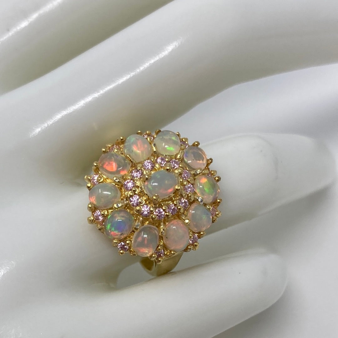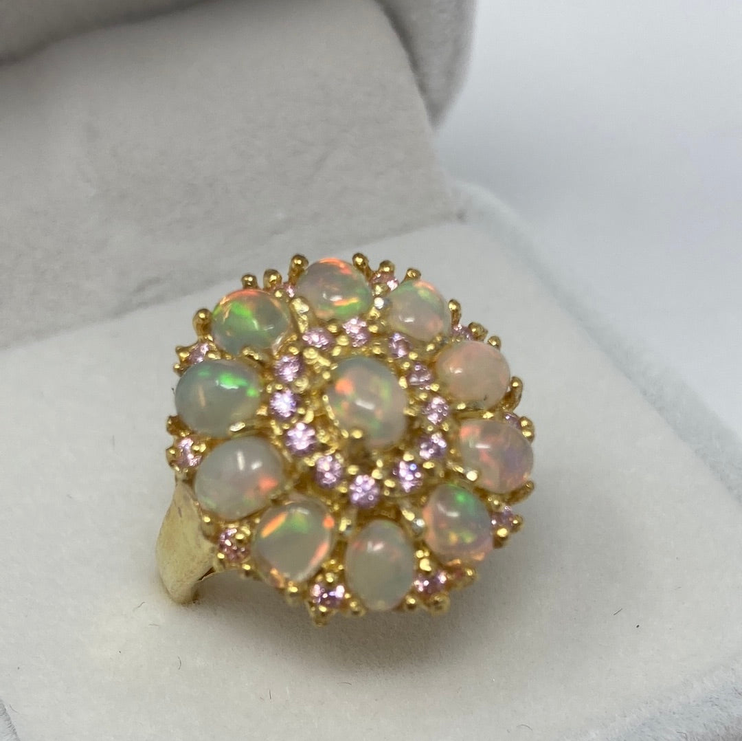 Wow, exceptional, genuine fiery Opals that explode with iridescent glowing fire. These natural gemstones are high quality and have selected for this custom made, one of a kind ring. Each gemstone measures 5mm by 4mm and is set in .925 sterling silver with a 14K yellow gold overlay. It is in a princess style setting that is timeless and elegant, sprinkled with tiny accent pink CZS. I only pick the best Opals with the most fire. Size 6 3/4 Resize at your jeweler or use a ring guard.