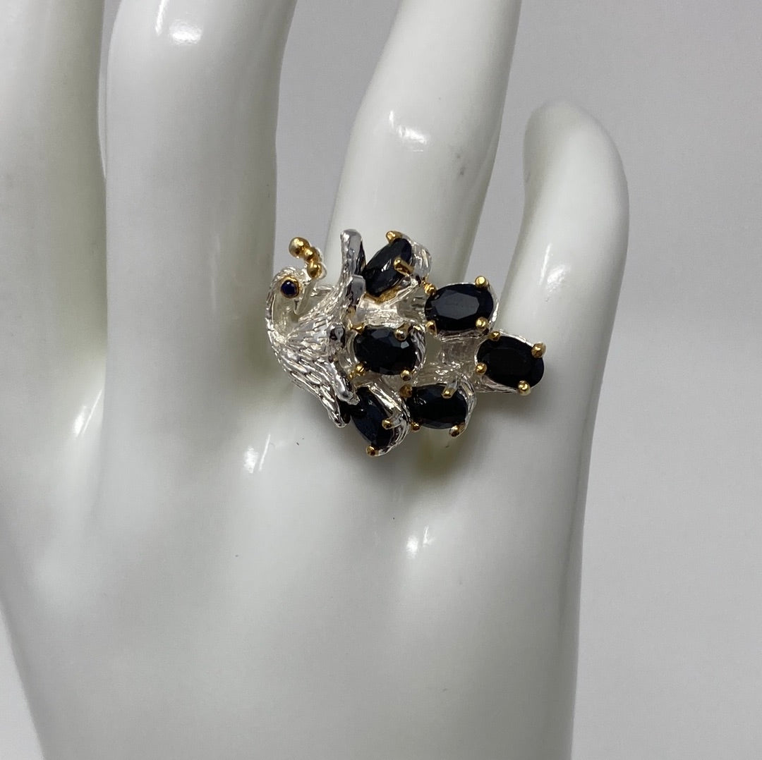 Exceptionally exquisite, all Genuine Sapphires adorned upon artistic Petey The Peacock. Crafted in .925 Sterling Silver with yellow gold accents on the prongs. An artistic treasure to add to your future heirloom collection. Size 6 1/2, Resize at your jeweler.