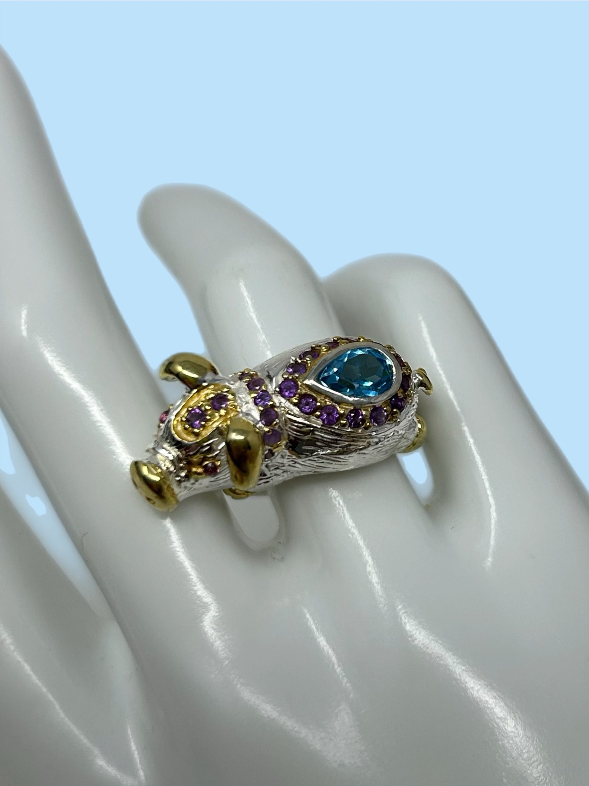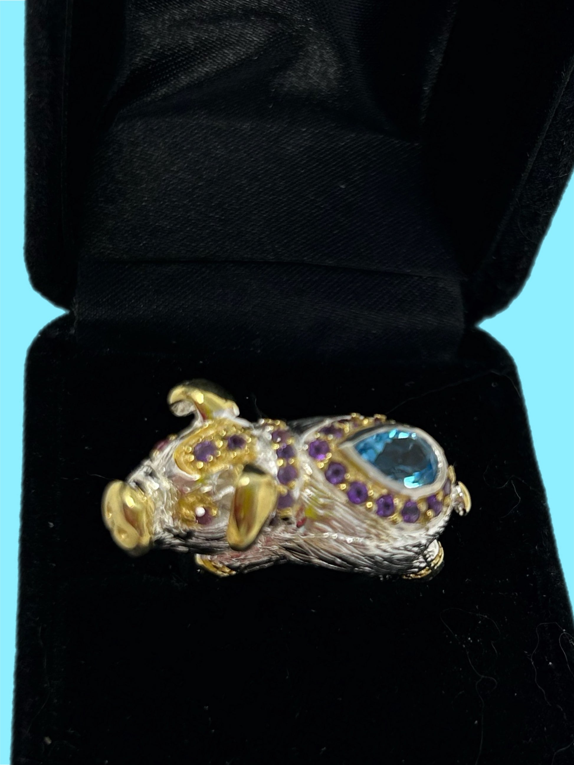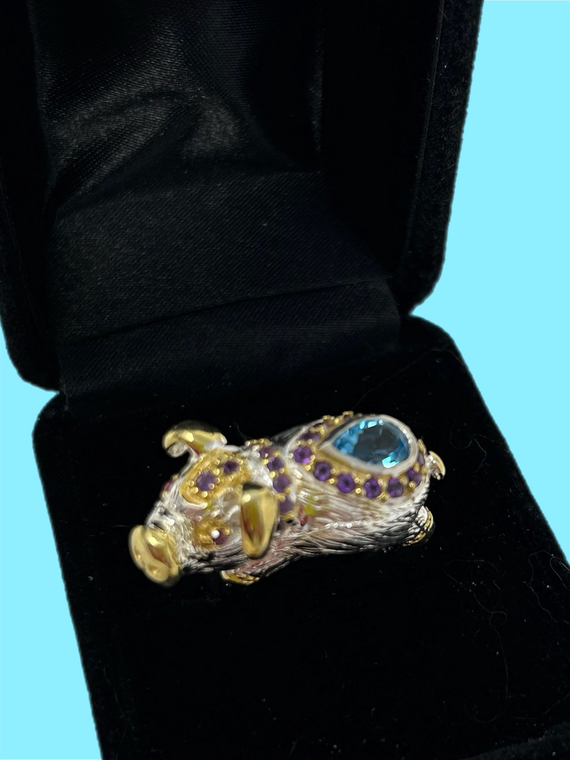 An Excellent Example of Unique Artistic Craftmanship. A intricate, majestic piggy, inset with a genuine Blue Topaz encrusted with Genuine Amethyst’s. A future heirloom that will be cherished for generations to come. This one of a kind is custom crafted in Sterling Silver. Size 8, Resize at your jeweler or use a ring guard.