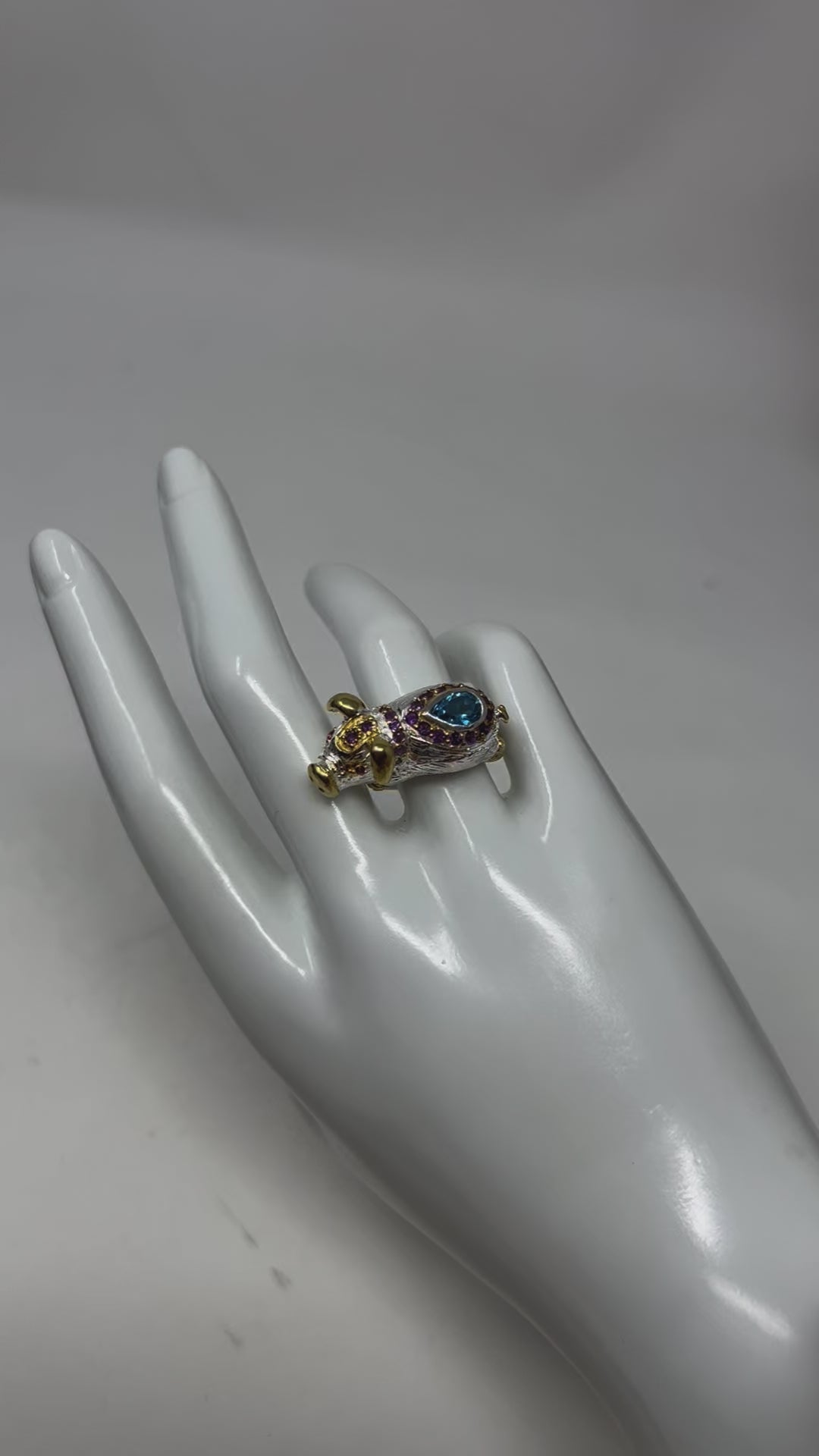 Artistic, Genuine Blue Topaz & Amethyst Unique Piggy Ring