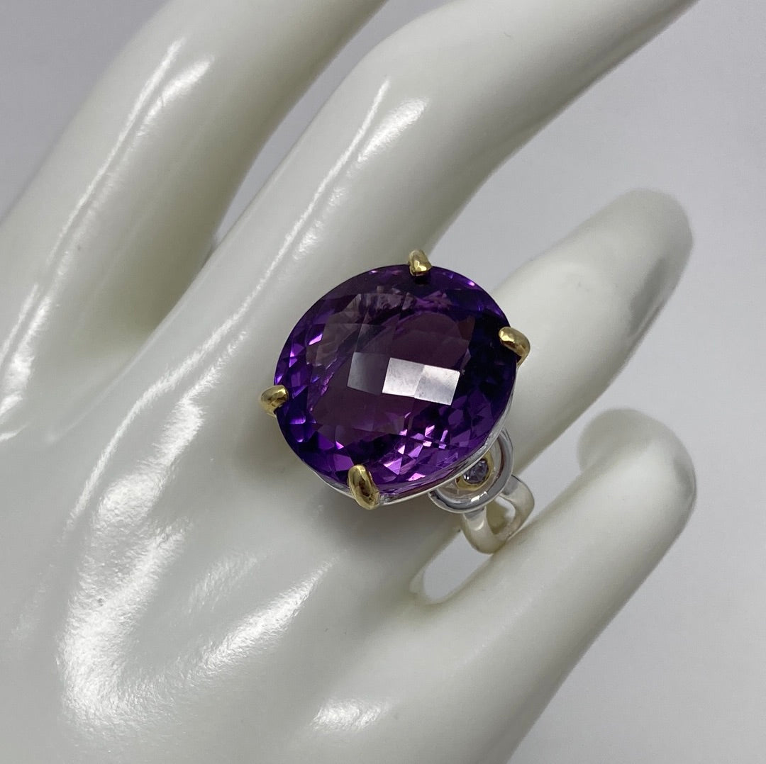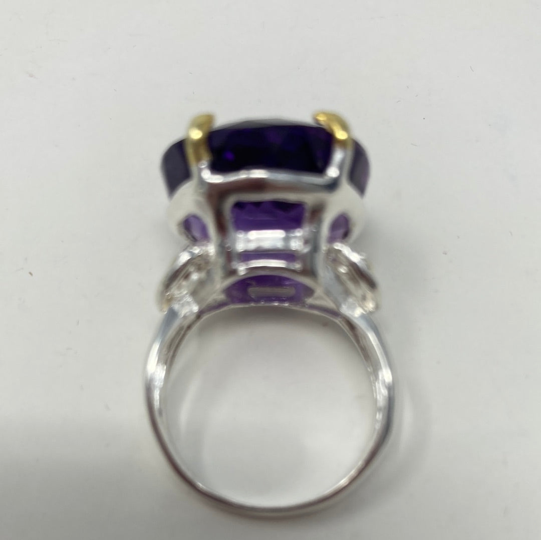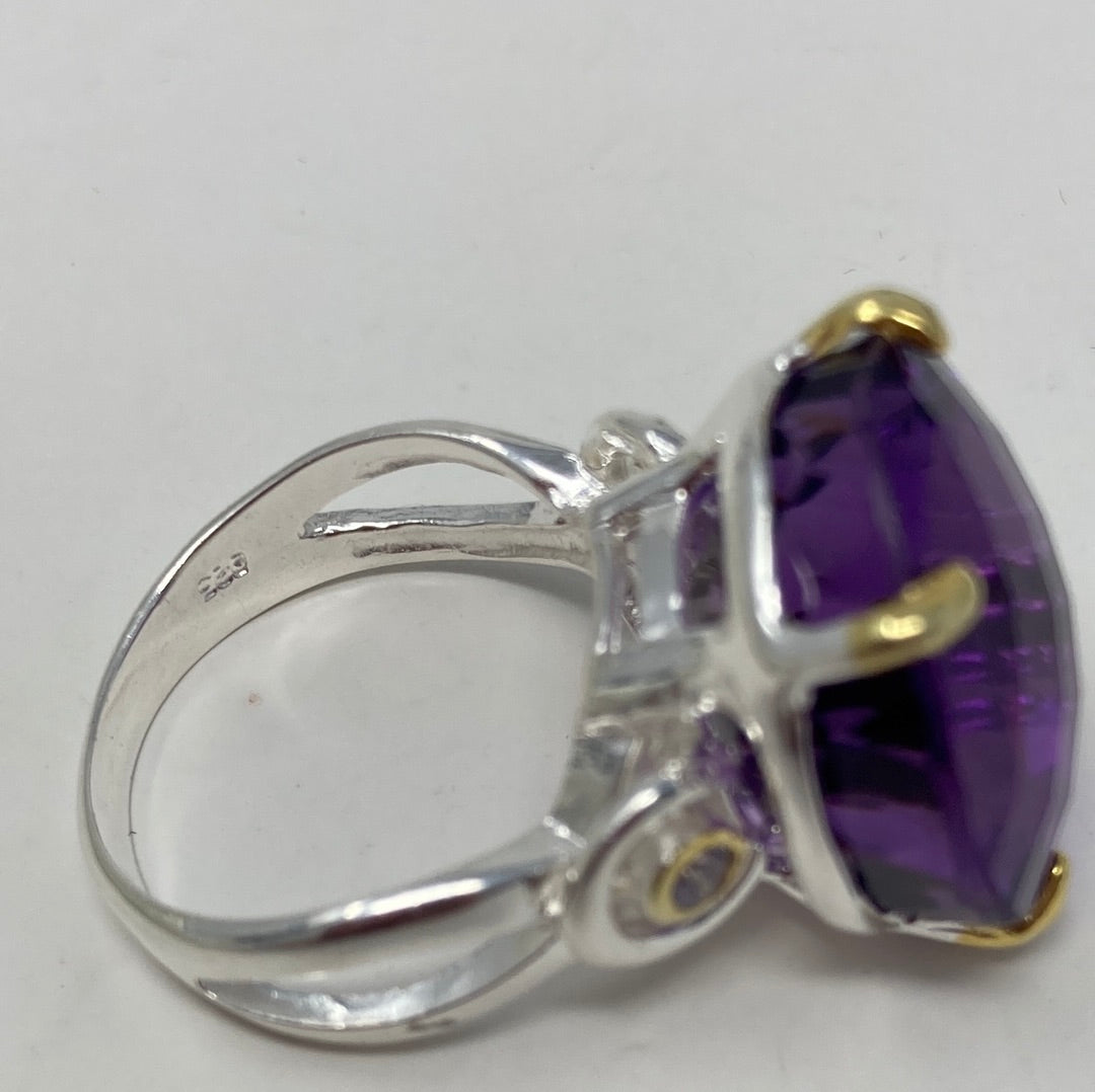 This high quality natural genuine Amethyst features that unique checkerboard faceting that reflects light and sparkle to snow off this gemstone. 24 CTW of majestic natural gemstone. Custom made mine if a kind set in .925 Sterling Silver. Accented on the sides with tiny CZS. Size 8, Resize your at jeweler or use a ring guard.