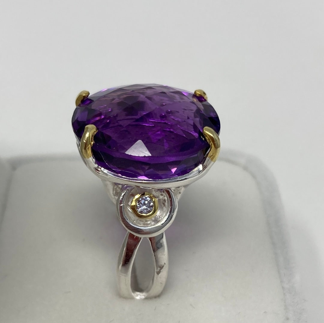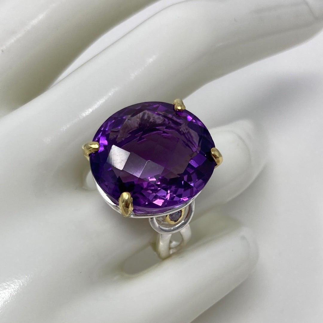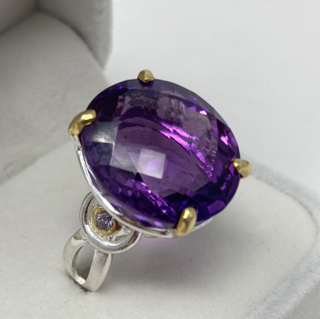 This high quality natural genuine Amethyst features that unique checkerboard faceting that reflects light and sparkle to snow off this gemstone. 24 CTW of majestic natural gemstone. Custom made mine if a kind set in .925 Sterling Silver. Accented on the sides with tiny CZS. Size 8, Resize your at jeweler or use a ring guard.