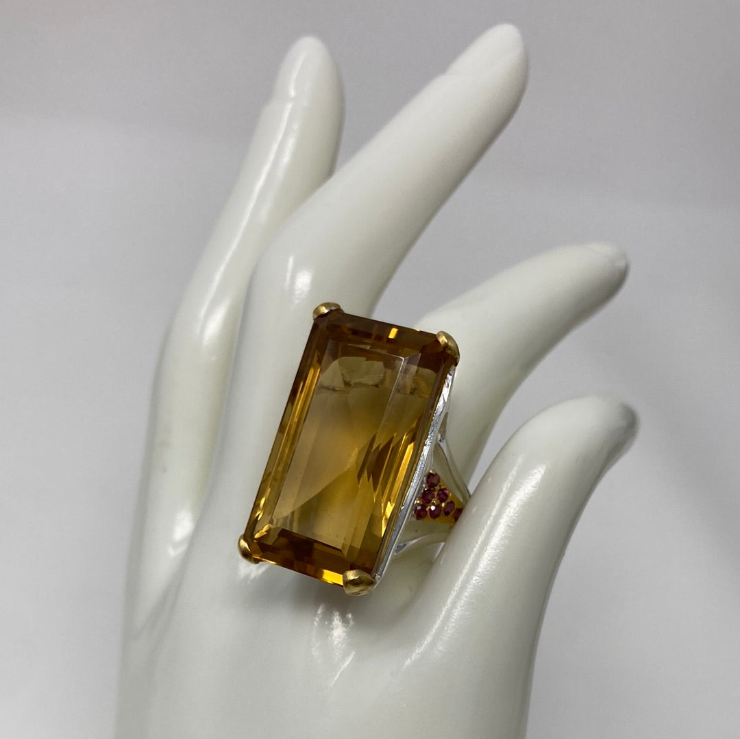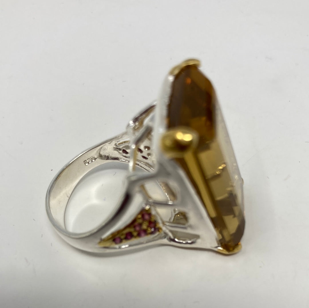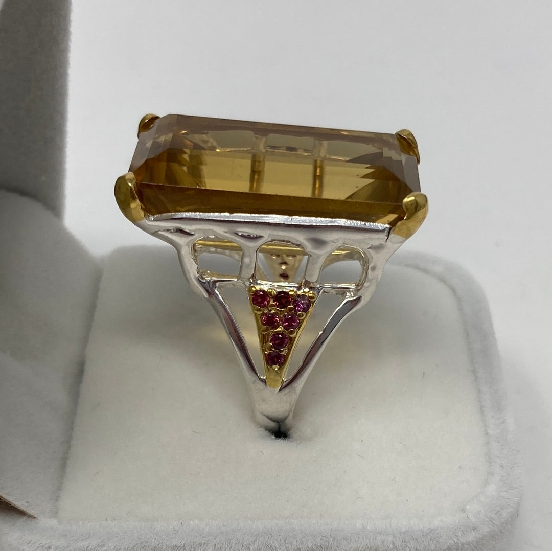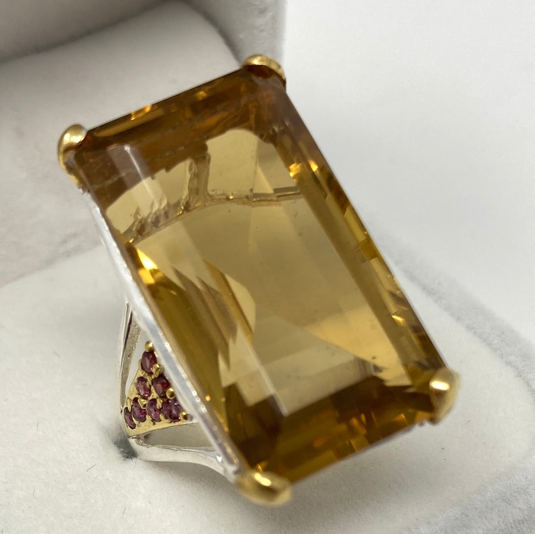 Wow this is extraordinary, majestic and regal, this rare 45 CTW genuine Citrine. A spectacular gemstone faceted in that highly desirable emerald cut. A treasure for many lifetimes to come, flanked on each side by genuine e Rhodolite Garnets too. Set in .925 Sterling Silver Size 7 1/2 Resize at your jeweler or use a ring guard.