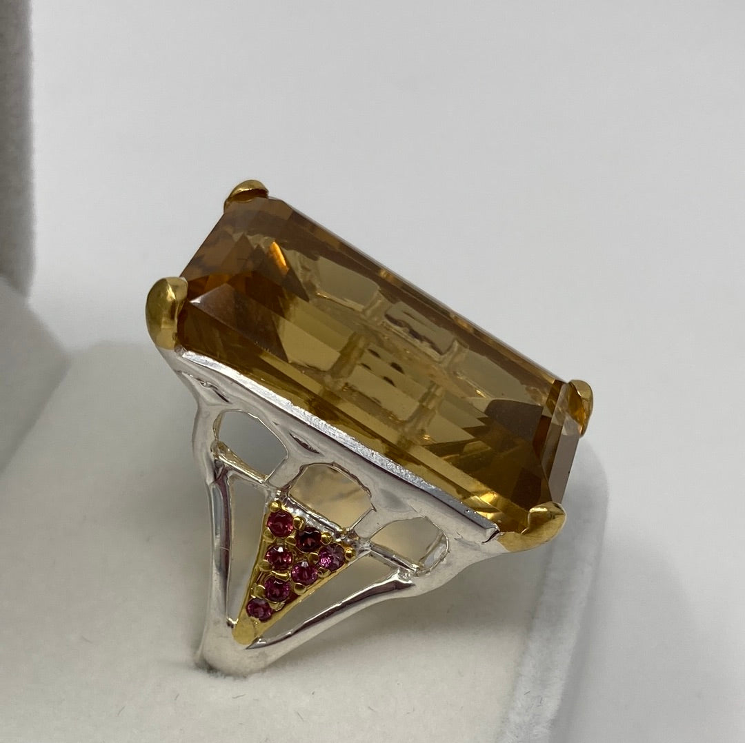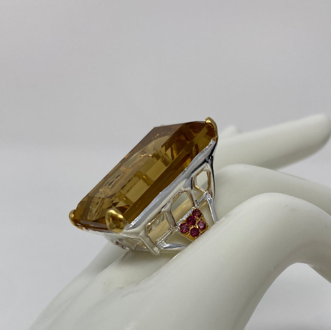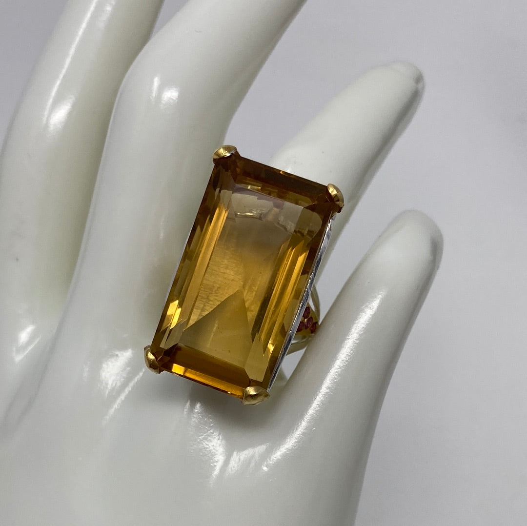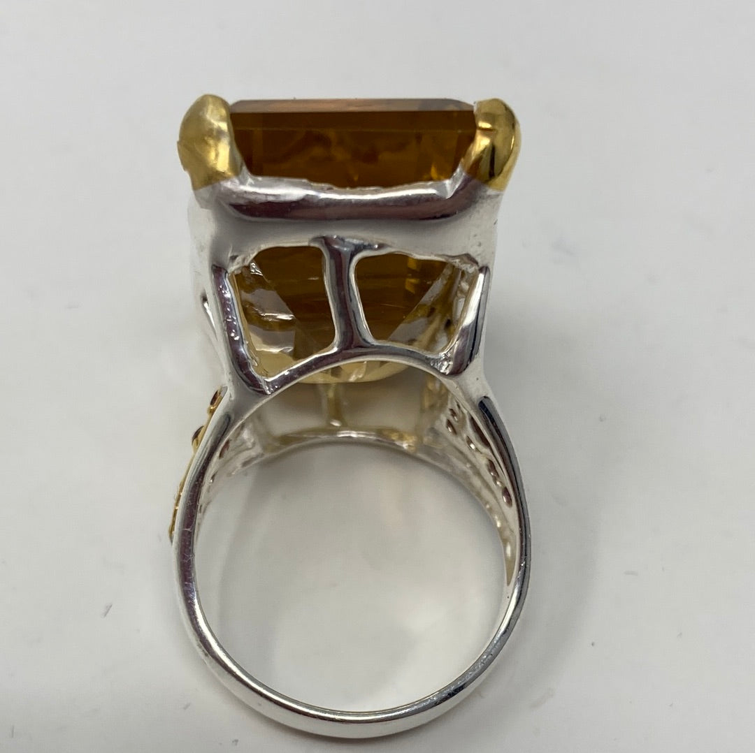 Wow this is extraordinary, majestic and regal, this rare 45 CTW genuine Citrine. A spectacular gemstone faceted in that highly desirable emerald cut. A treasure for many lifetimes to come, flanked on each side by genuine e Rhodolite Garnets too. Set in .925 Sterling Silver Size 7 1/2 Resize at your jeweler or use a ring guard.