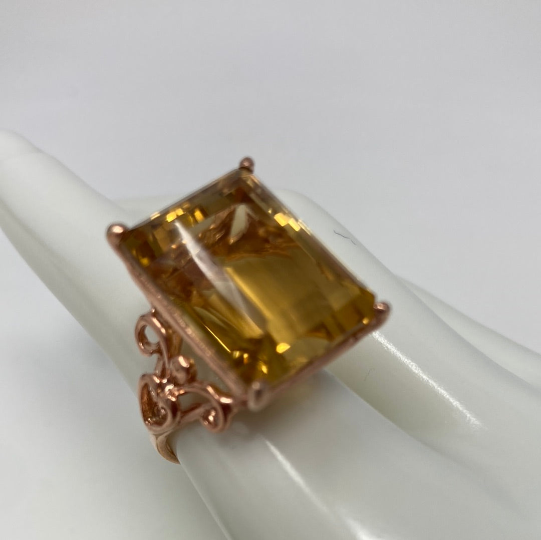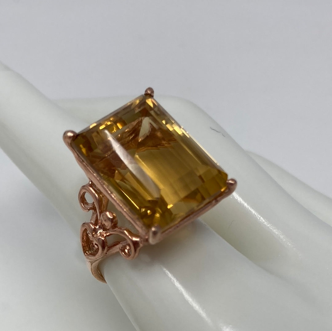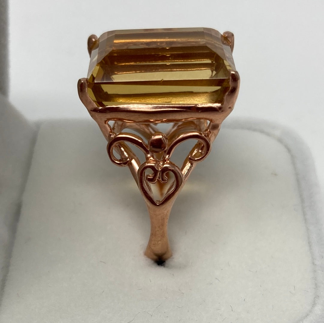 An enchanting, elegant genuine Citrine Ring of 27 CTW! This is extra special, a highly sought after emerald faceting on this genuine gemstone. Set in .925 Sterling Silver with a unique Rose Gold overlay, simply breathtaking. This is a custom made, one of kind ring, cannot mass produced, most jewelers order from gem wholesalers with small gemstones that they rush off to manufacture in large quantities to maximize profits on inferior small stones. I personally hand select these gemstone treasures from talented artists. Size 7 1/2, Resize at your jeweler or use a ring guard