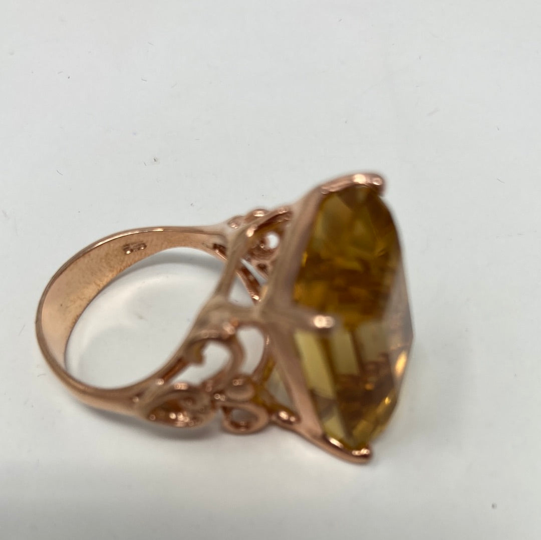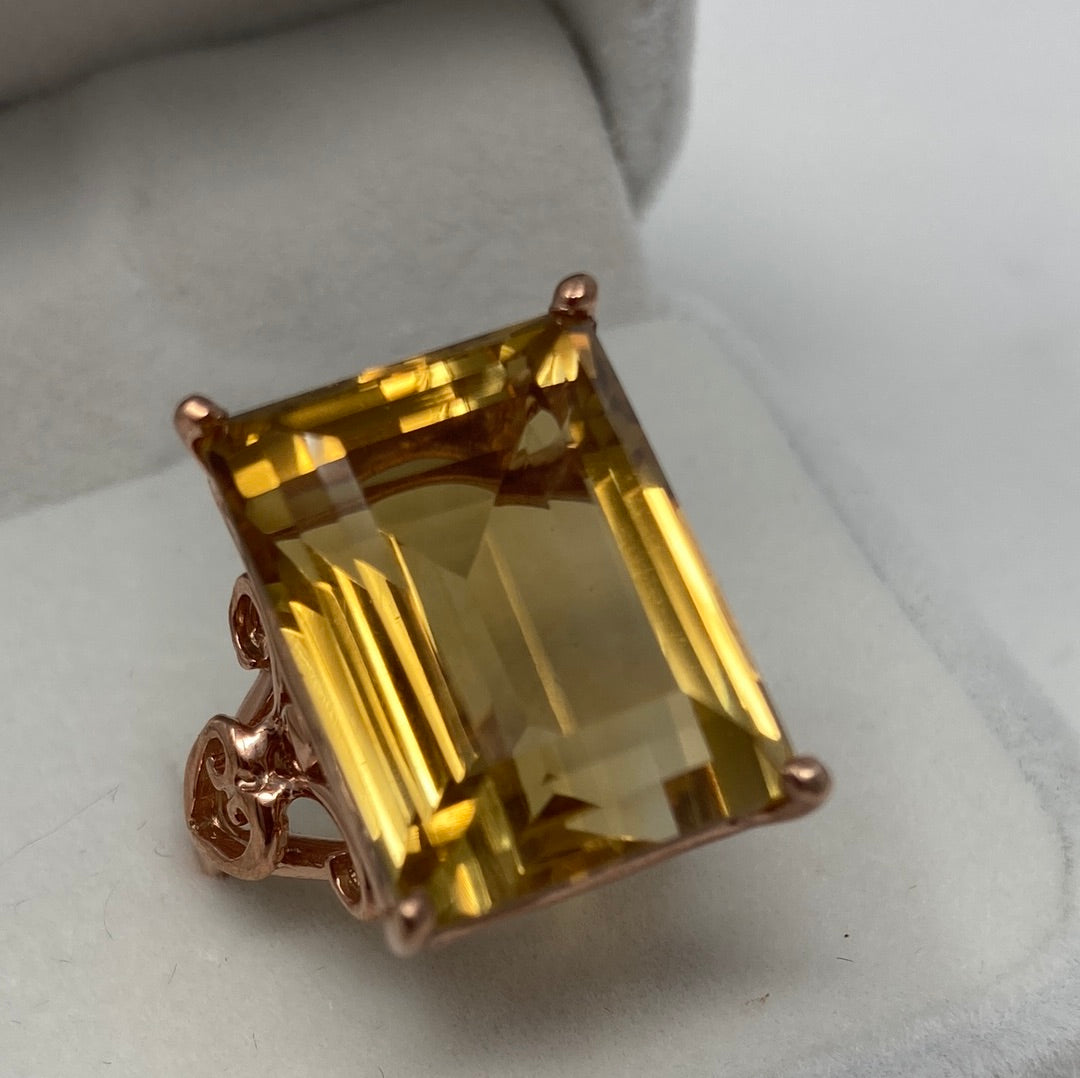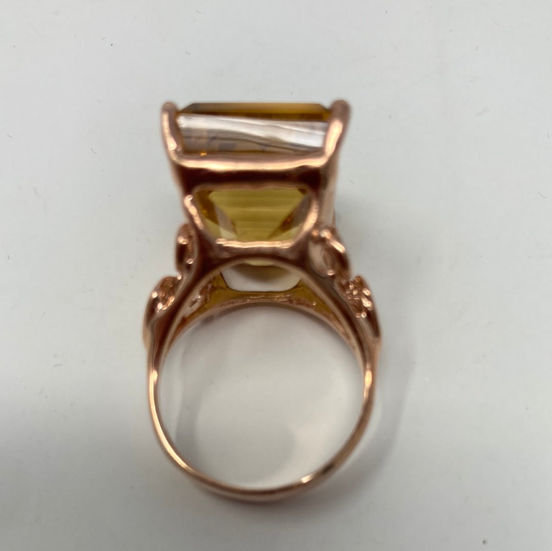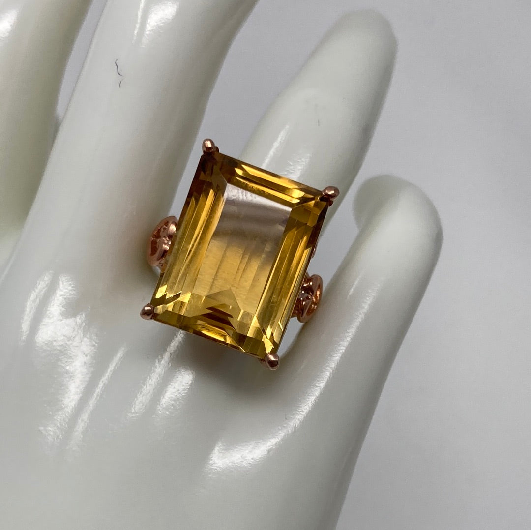 An enchanting, elegant genuine Citrine Ring of 27 CTW! This is extra special, a highly sought after emerald faceting on this genuine gemstone. Set in .925 Sterling Silver with a unique Rose Gold overlay, simply breathtaking. This is a custom made, one of kind ring, cannot mass produced, most jewelers order from gem wholesalers with small gemstones that they rush off to manufacture in large quantities to maximize profits on inferior small stones. I personally hand select these gemstone treasures from talented artists. Size 7 1/2, Resize at your jeweler or use a ring guard