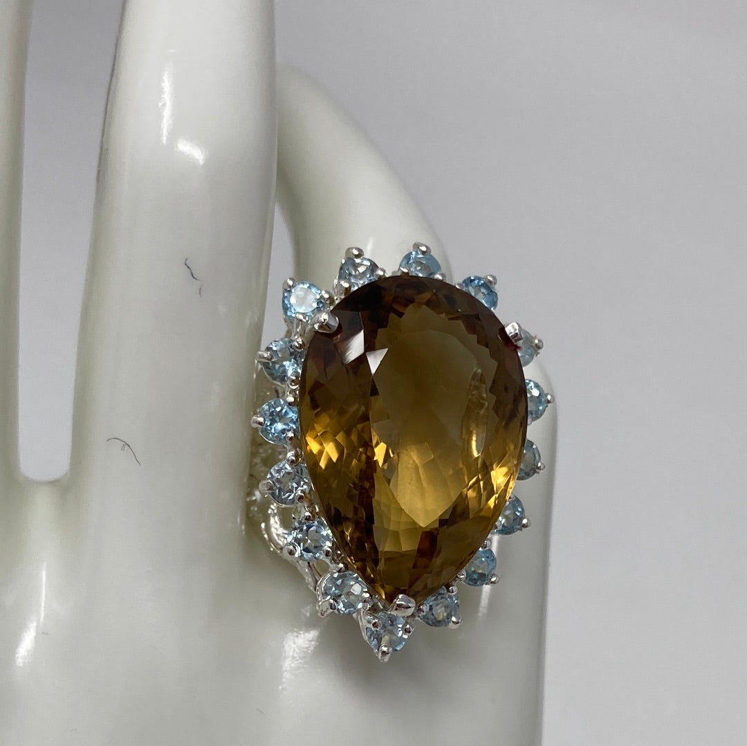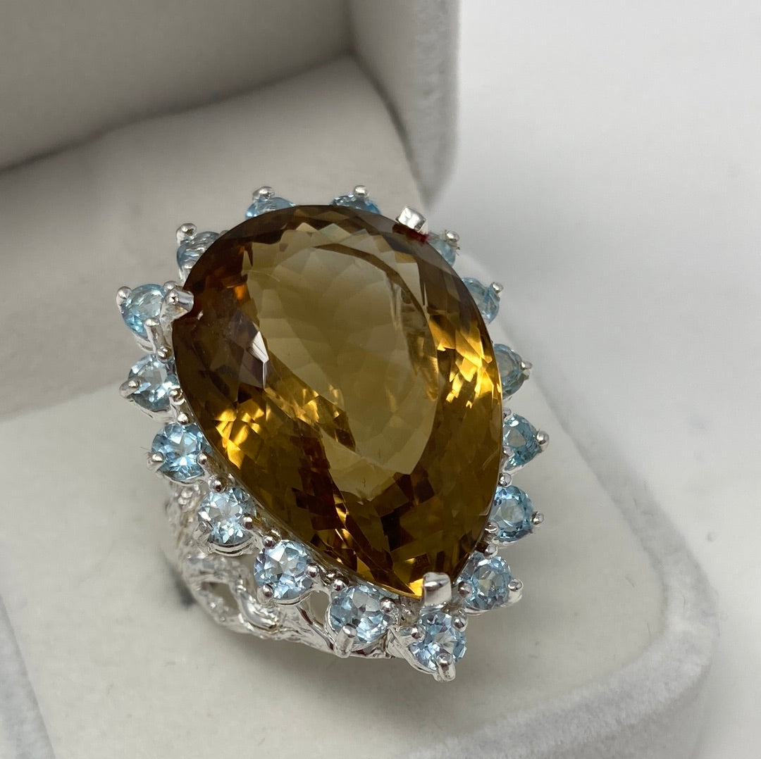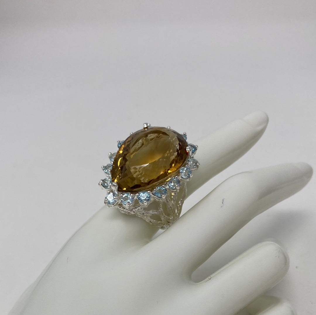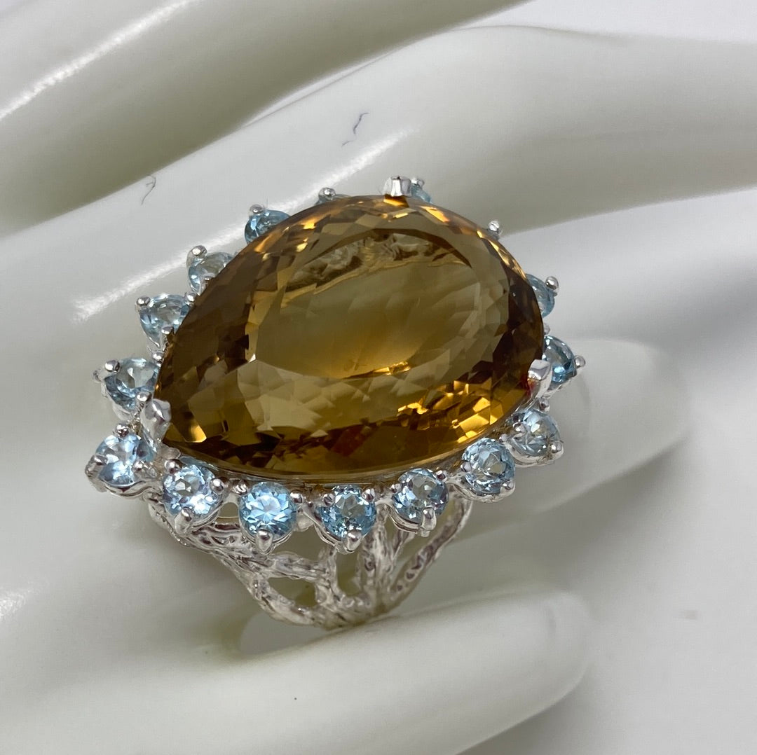 Unbelievably gorgeous, a special gemstone specimen faceted in a highly desirable pear shape. This genuine golden Citrine has a very lux, high end look like that of a Harry Winston design. This is a one of a kind from my curated collection of the most unique and high quality gems from the finest artisans. This prized Citrine is encrusted with genuine Blue Topaz, framing the Citrine in elegance. Set in a custom crafted .925 Sterling Silver setting made for this fabulous gemstone. A true treasure to last many lifetimes for your heirloom gemstone collection. Size 7, Resize at your jeweler or use a ring guard