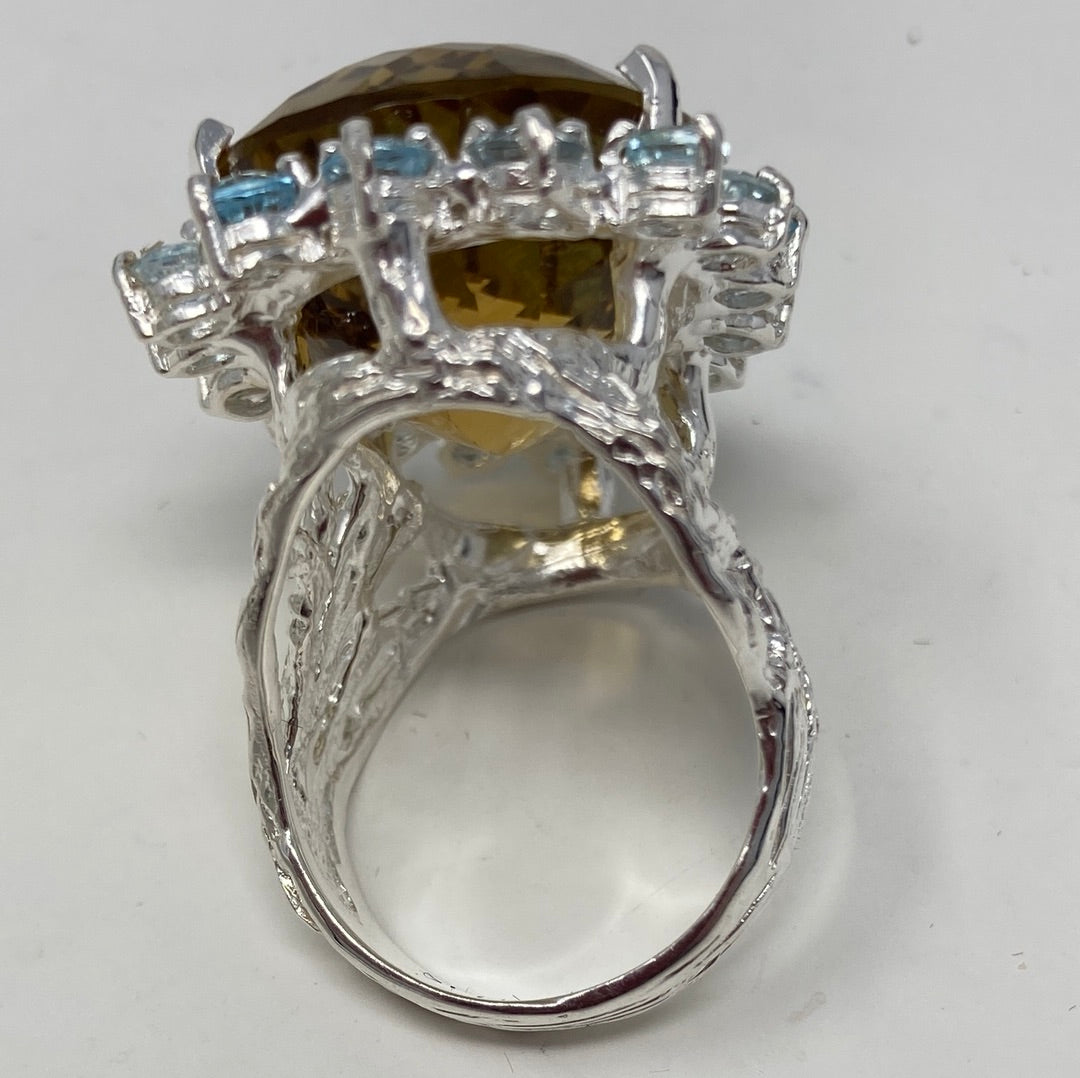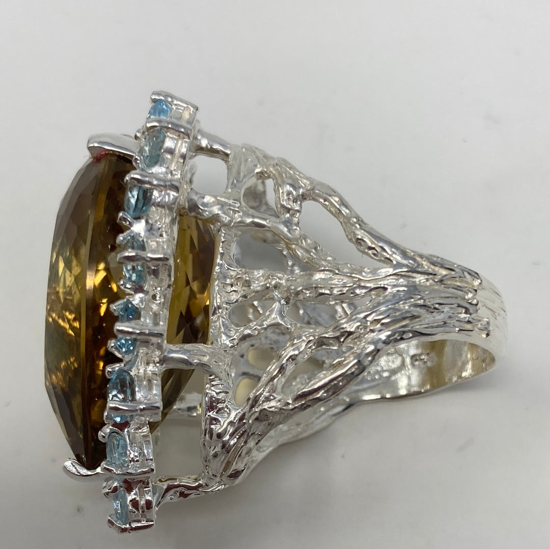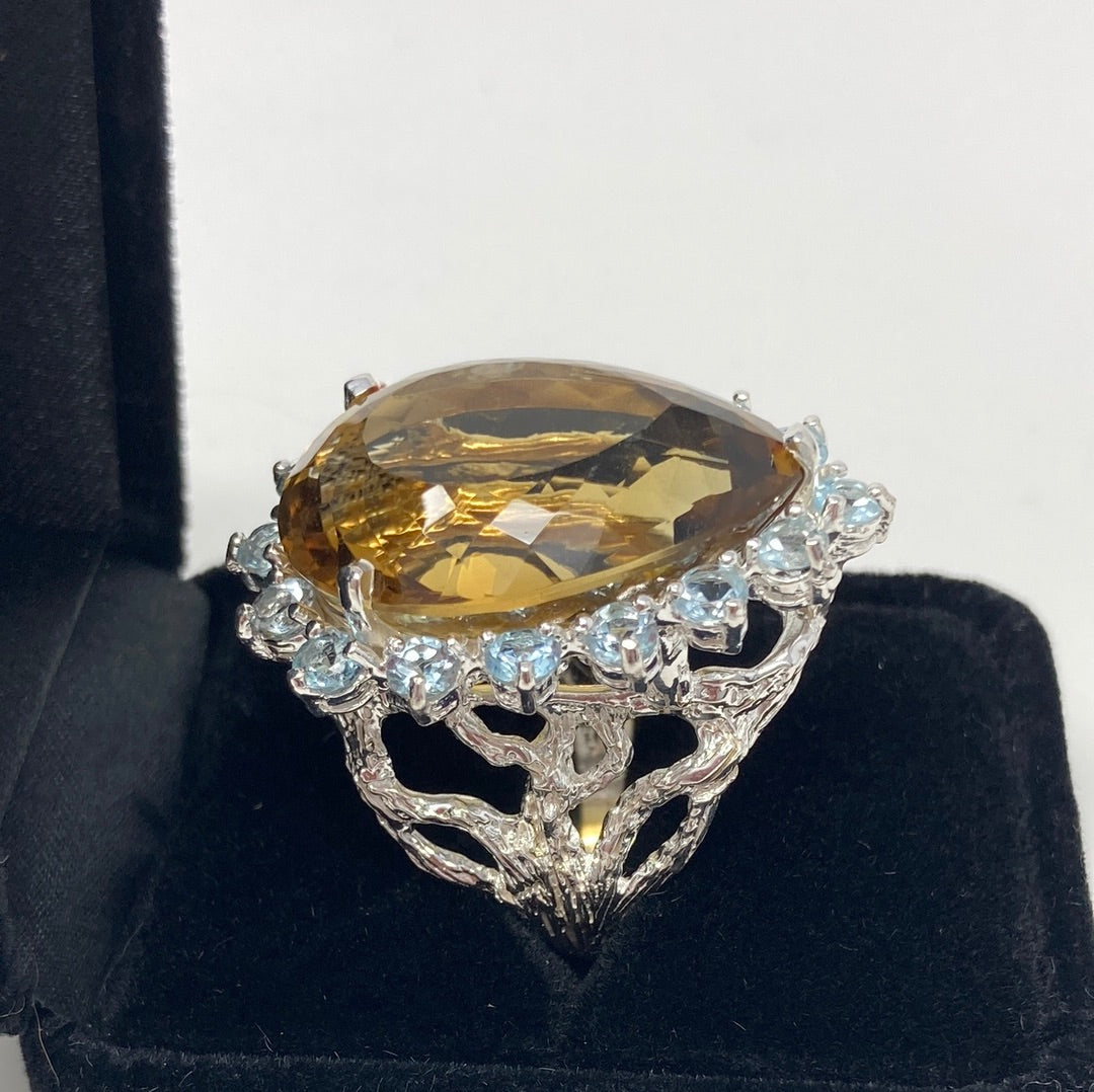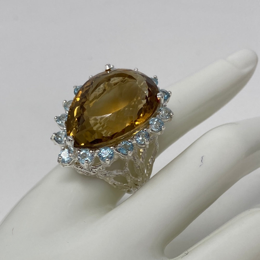 Unbelievably gorgeous, a special gemstone specimen faceted in a highly desirable pear shape. This genuine golden Citrine has a very lux, high end look like that of a Harry Winston design. This is a one of a kind from my curated collection of the most unique and high quality gems from the finest artisans. This prized Citrine is encrusted with genuine Blue Topaz, framing the Citrine in elegance. Set in a custom crafted .925 Sterling Silver setting made for this fabulous gemstone. A true treasure to last many lifetimes for your heirloom gemstone collection. Size 7, Resize at your jeweler or use a ring guard