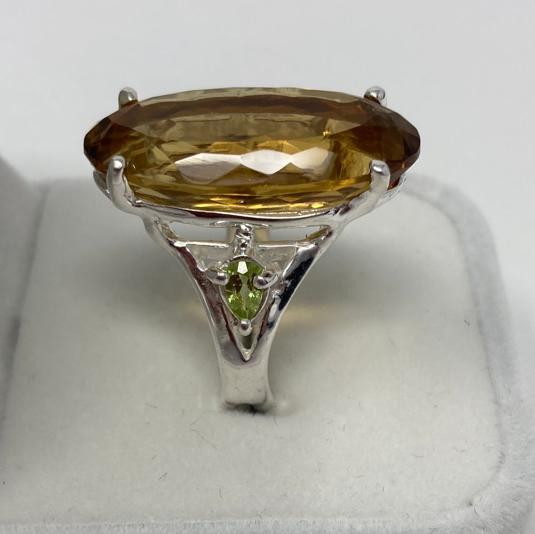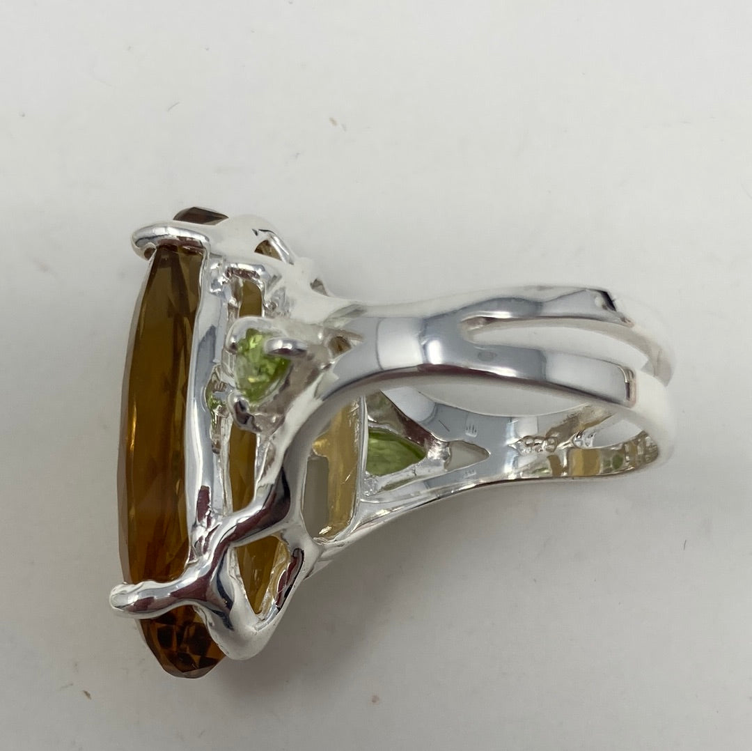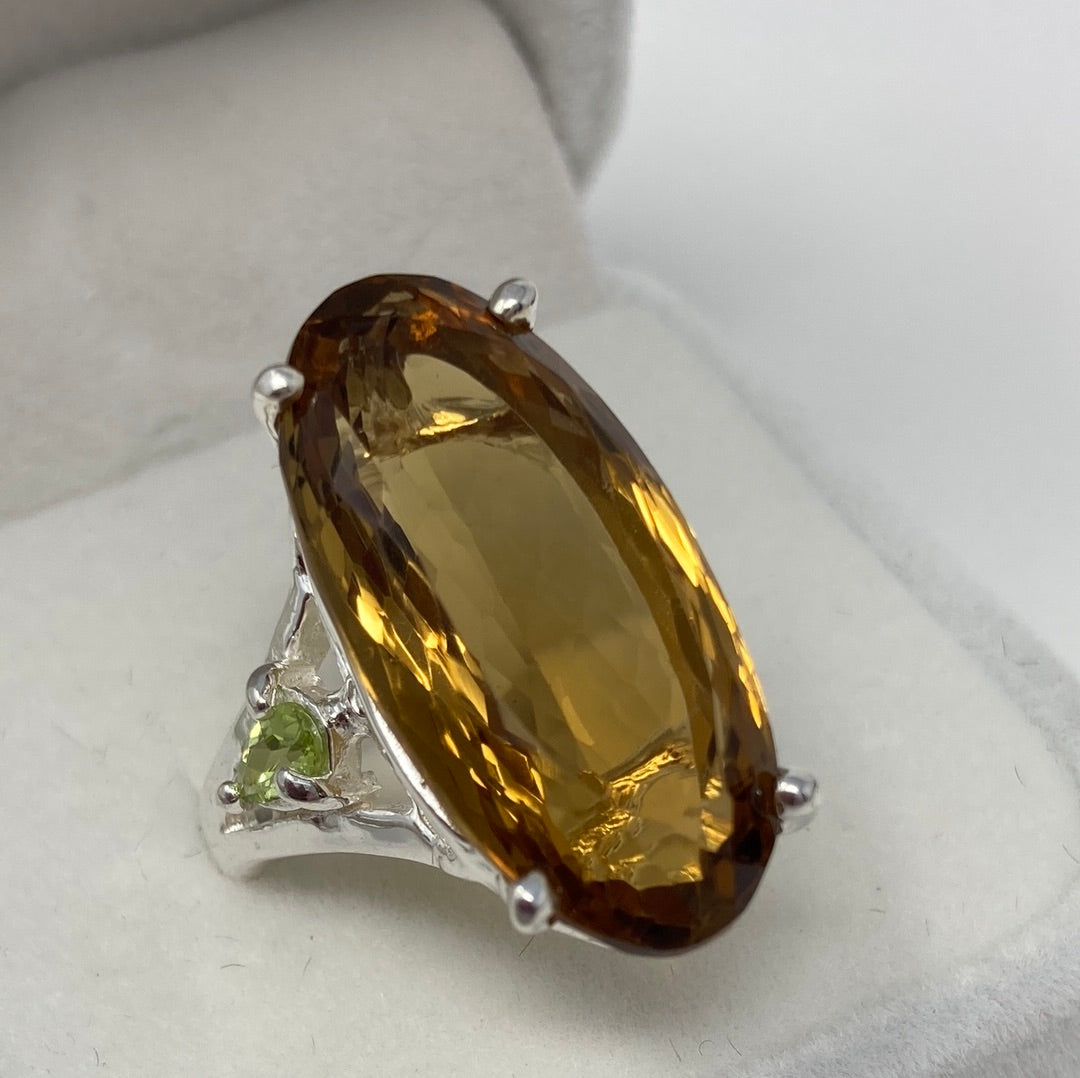 This is a sure way to display, refined elegant especially with a genuine 28 CTW Citrine gemstone. Notice the exquisite pear shaped genuine Peridot flanking each side. This is a custom made, one of a kind ring that is not something massed produced for the retail jewelry trade. I hand select each treasure and know that these are for many lifetimes to come for your heirloom collection. Artistic pierces that are as unique as you. Set in .925 sterling silver. Size 7 1/2. Resize at your jeweler or use a ring guard.
