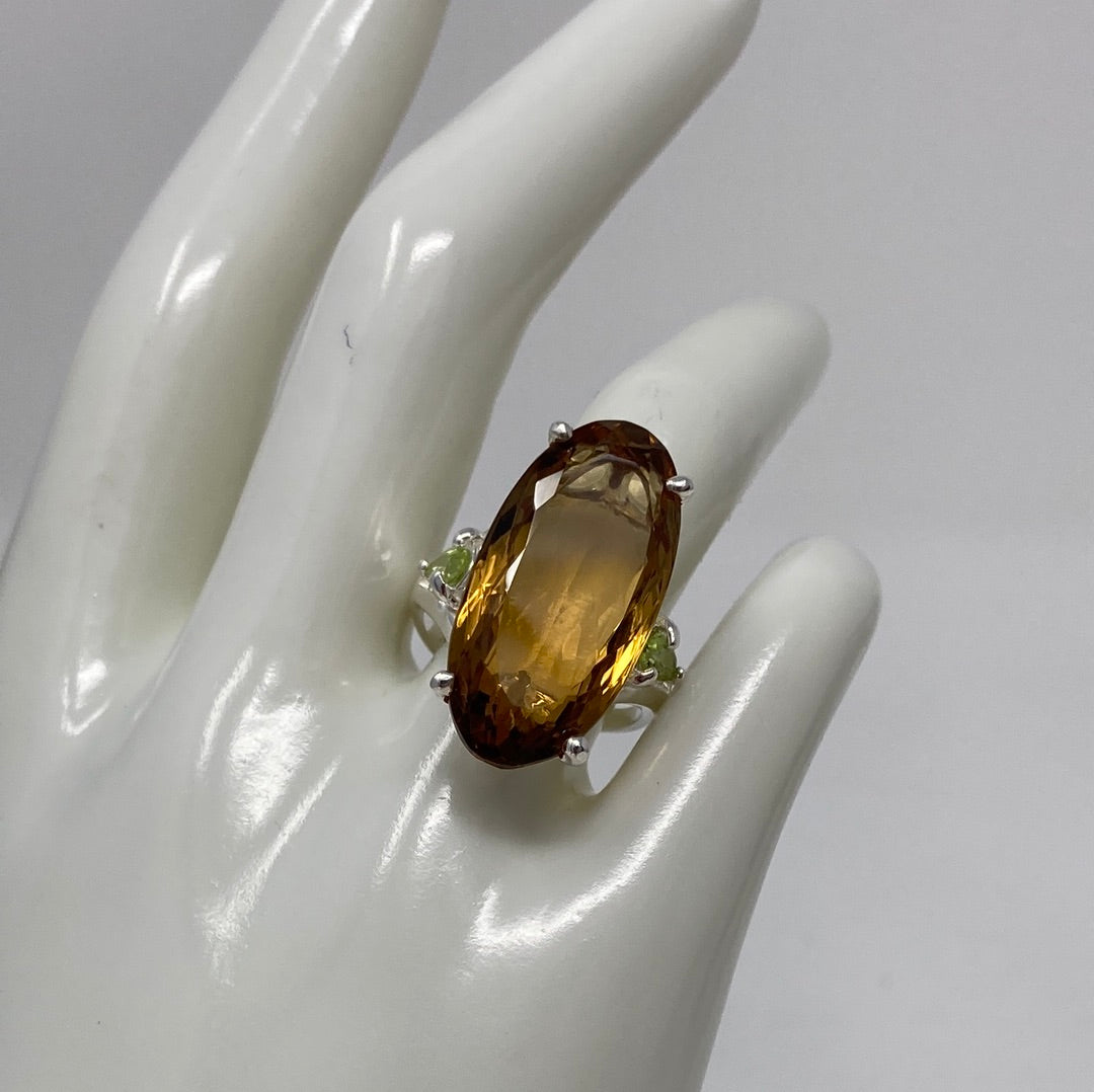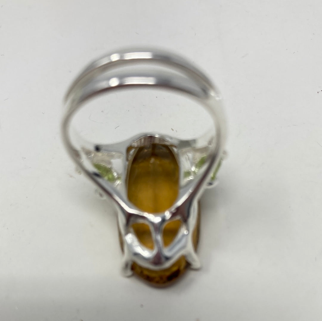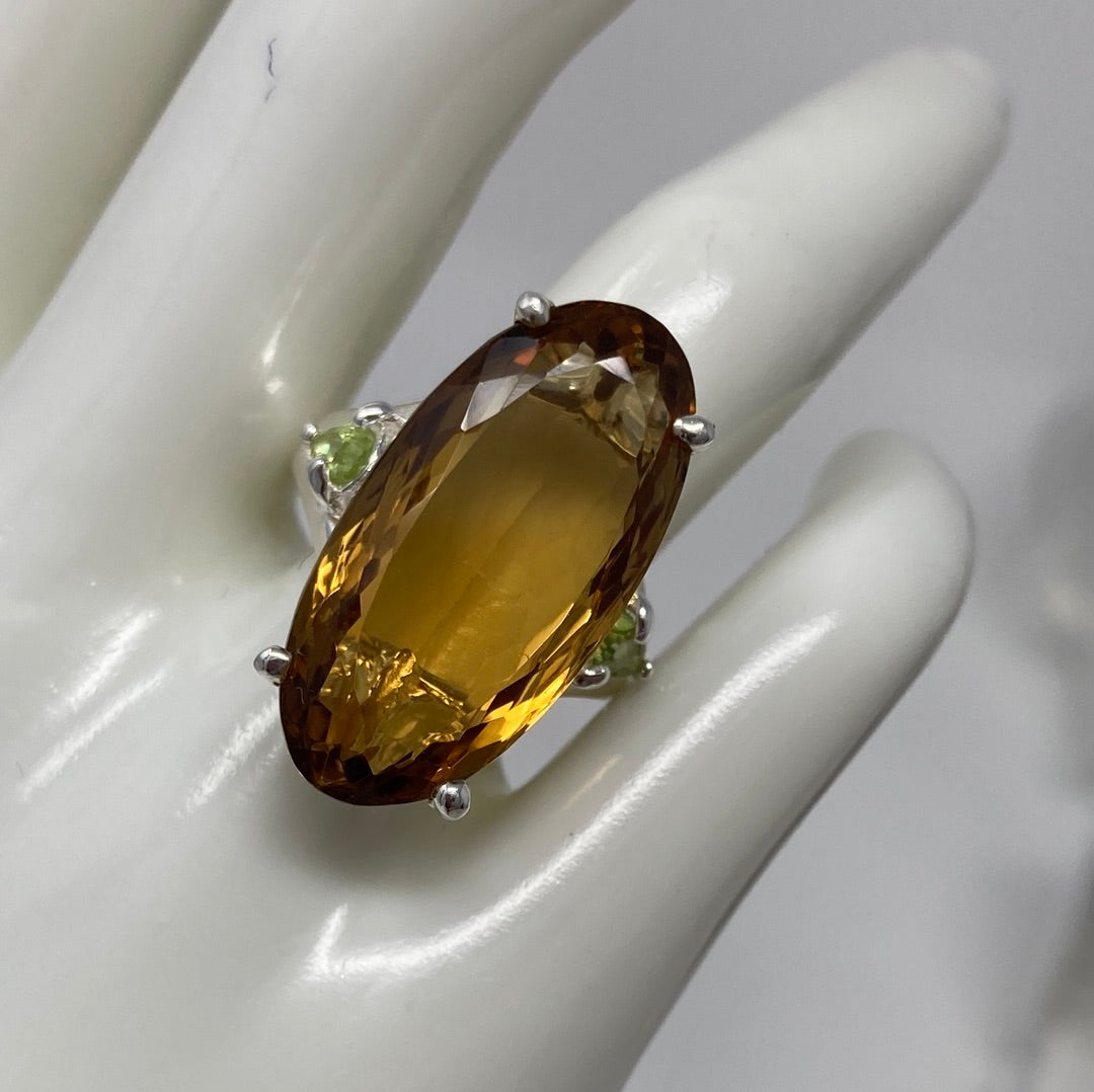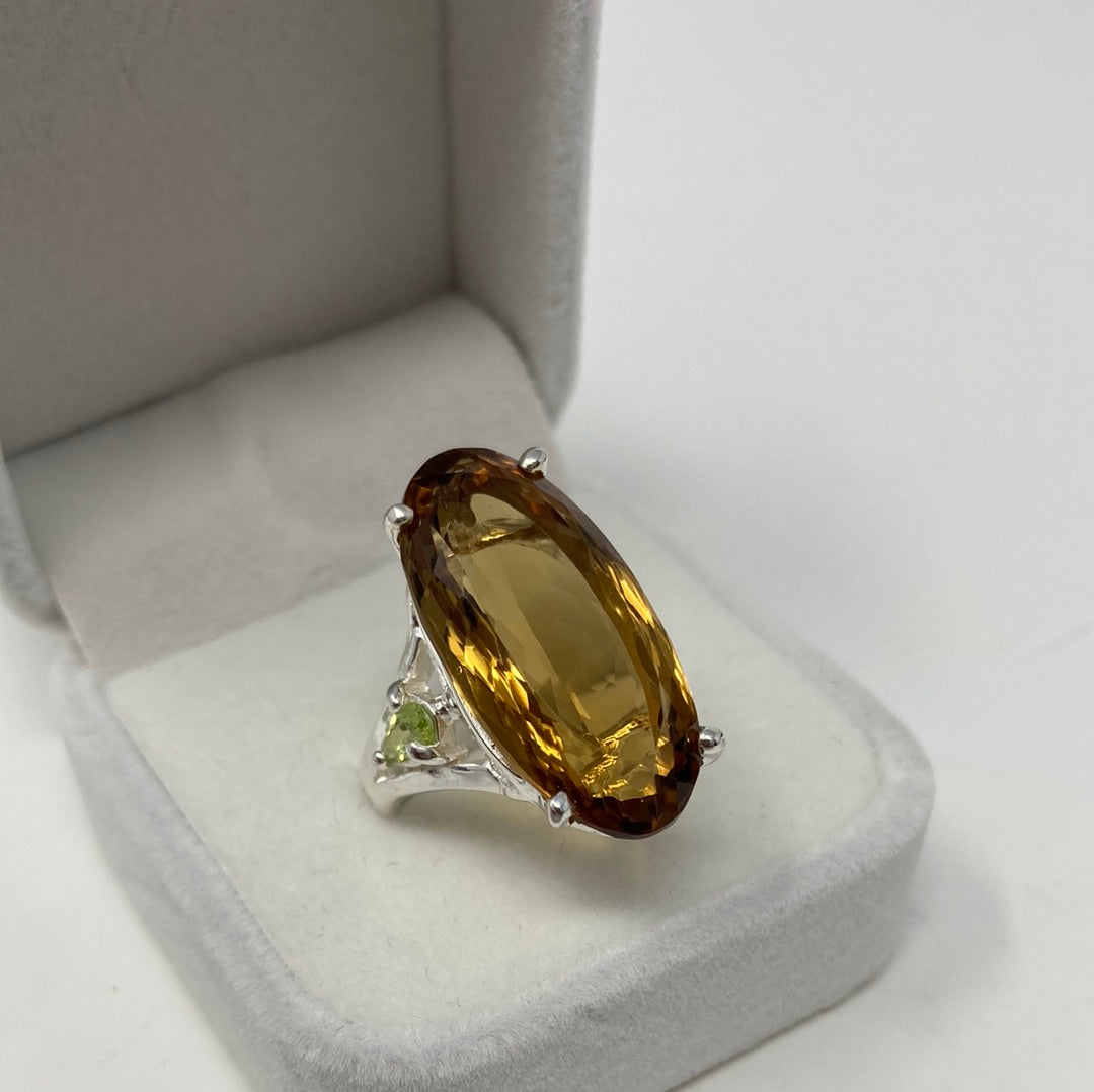 This is a sure way to display, refined elegant especially with a genuine 28 CTW Citrine gemstone. Notice the exquisite pear shaped genuine Peridot flanking each side. This is a custom made, one of a kind ring that is not something massed produced for the retail jewelry trade. I hand select each treasure and know that these are for many lifetimes to come for your heirloom collection. Artistic pierces that are as unique as you. Set in .925 sterling silver. Size 7 1/2. Resize at your jeweler or use a ring guard.