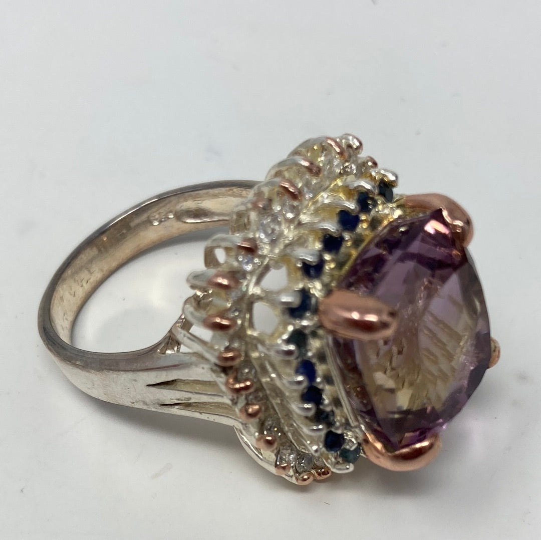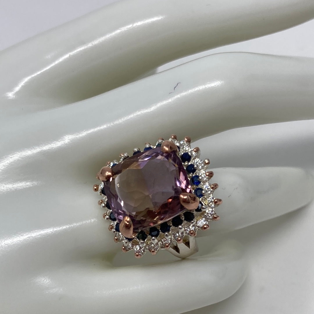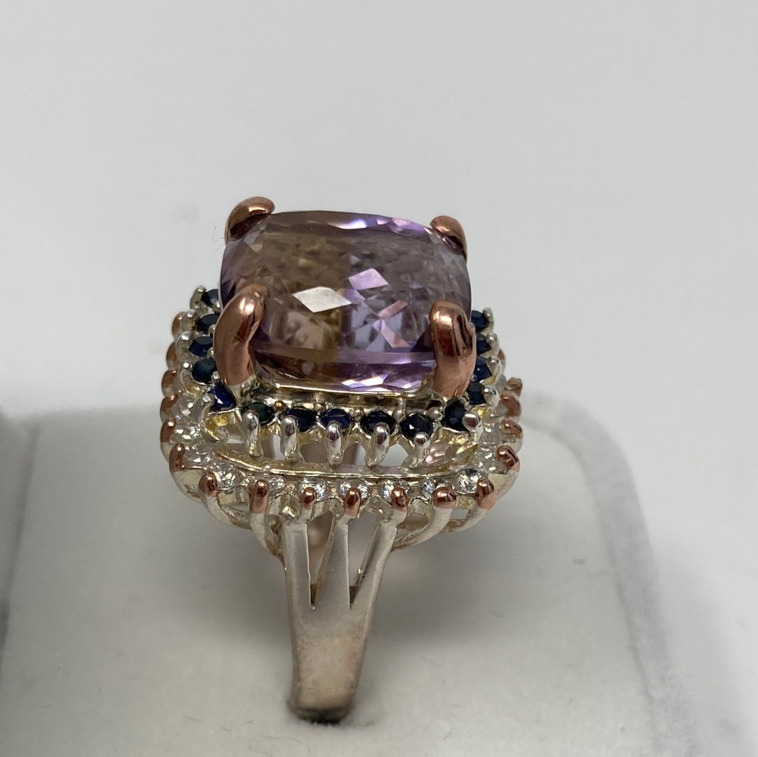 A magnificent high quality genuine Ametrine measuring over 10 CTW surrounded by genuine deep blue Sapphires and white Topaz. A work of art, Ametrine gemstones are extremely desirable, the are the naturally occurring marriage of genuine Amethyst and Citrine. It is natures work of art, distinctively different and elegant. Set in .925 Sterling Silver with Rose Gold Accents. Size 9, Resize at your jeweler or use a ring guard.