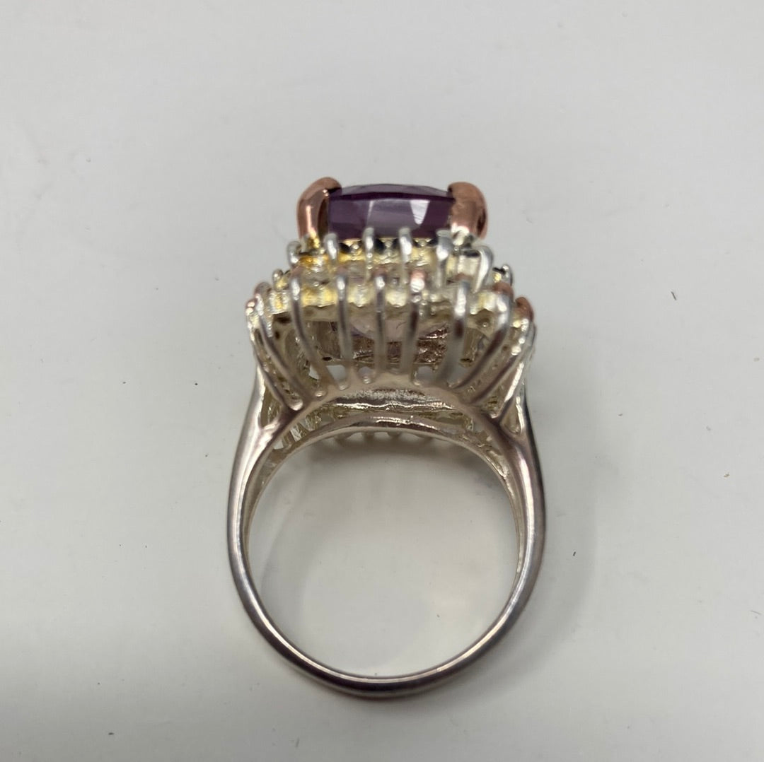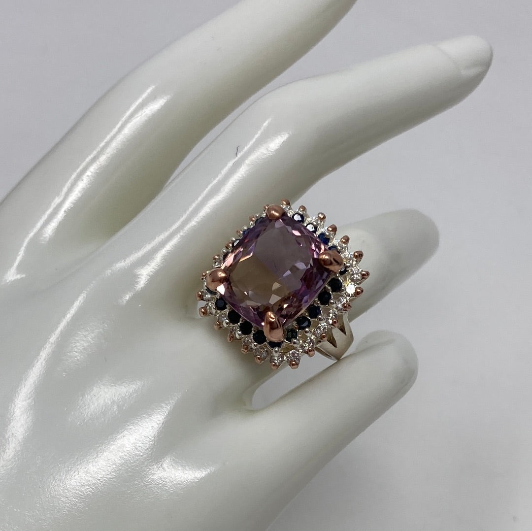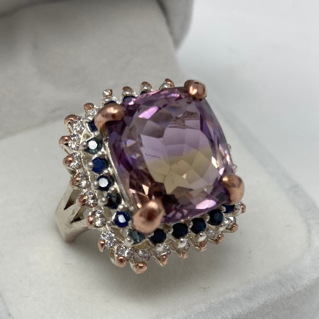 A magnificent high quality genuine Ametrine measuring over 10 CTW surrounded by genuine deep blue Sapphires and white Topaz. A work of art, Ametrine gemstones are extremely desirable, the are the naturally occurring marriage of genuine Amethyst and Citrine. It is natures work of art, distinctively different and elegant. Set in .925 Sterling Silver with Rose Gold Accents. Size 9, Resize at your jeweler or use a ring guard.