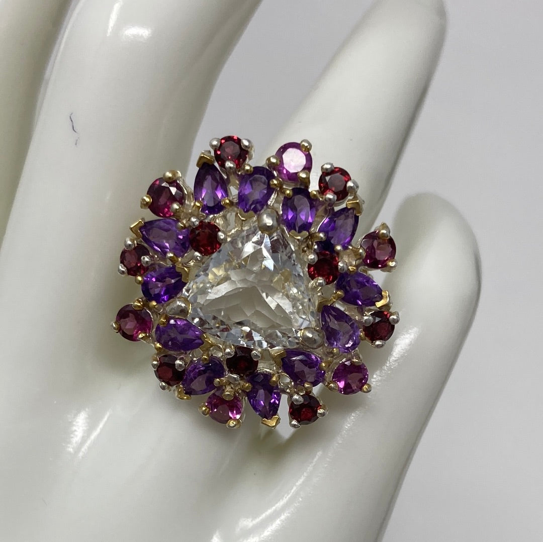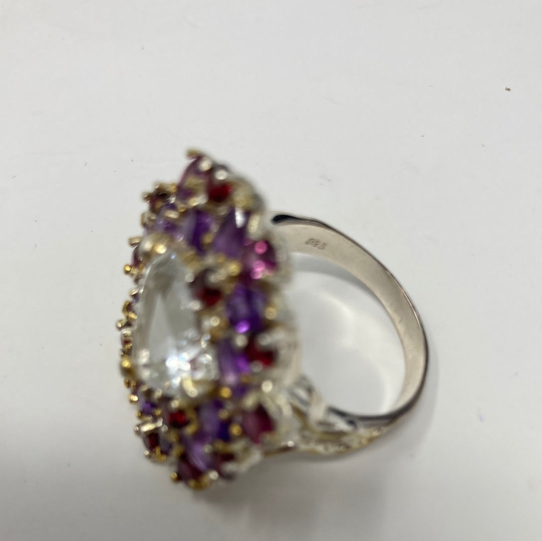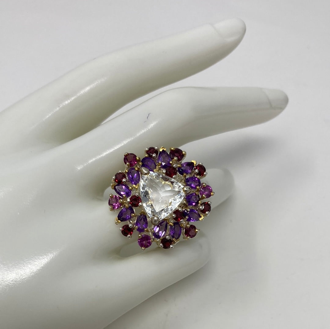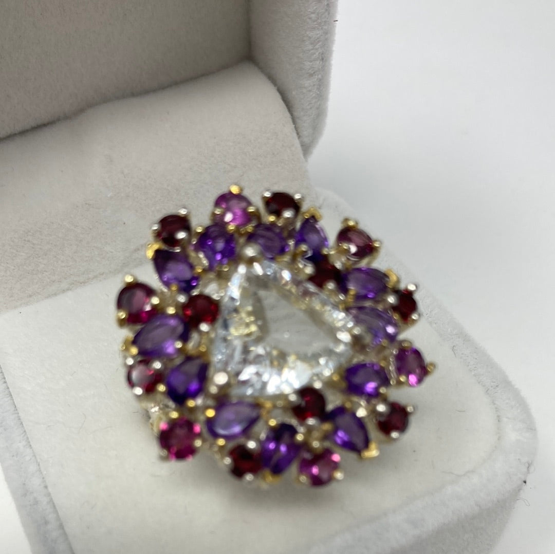 A rate find to find this high quality Genuine Aquamarine, it has everything, cut, color and clarity. The restful, calming watery blue that only a true Aquamarine can manifest. Encrusted with Genuine Amethysts and Rhodolite Garnets. A masterpiece of genuine gemstones set in .925 Sterling Silver. Notice the exquisite detailing in this custom made, one of a kind ring. Size 9 1/2, Resize at your jeweler or use a ring guard