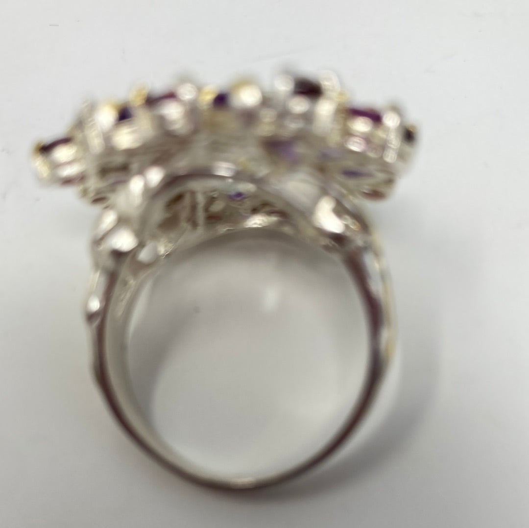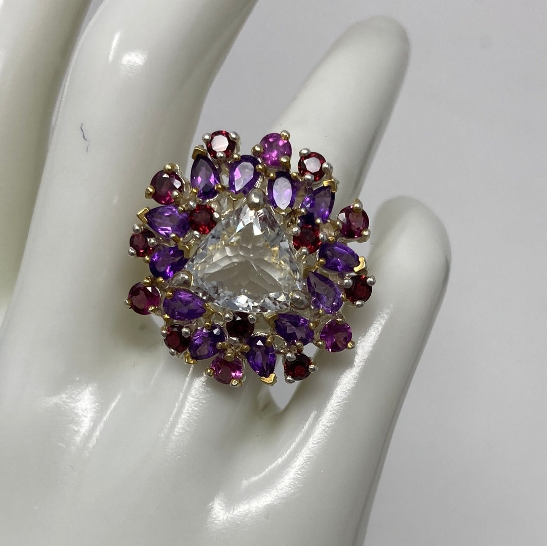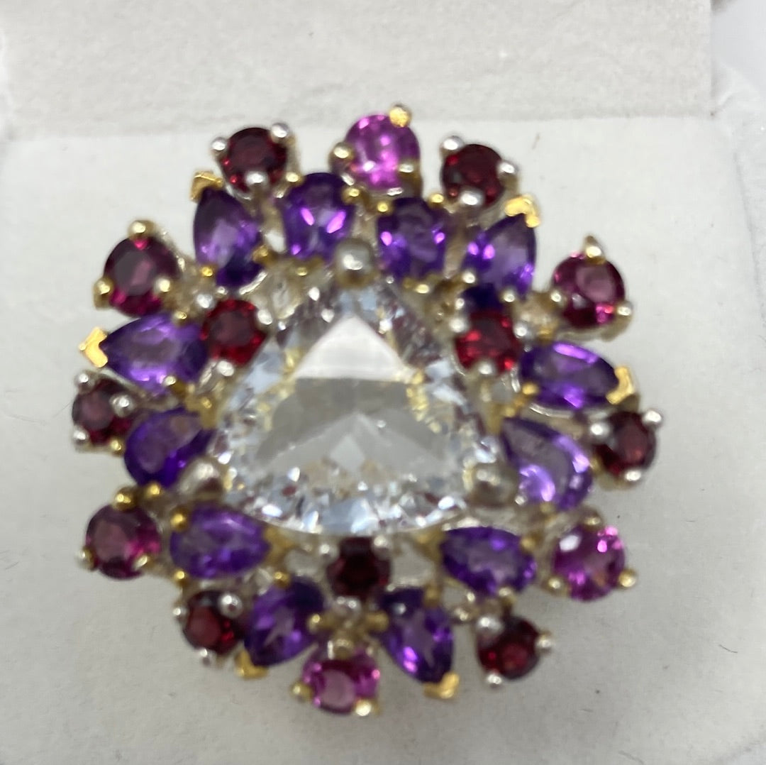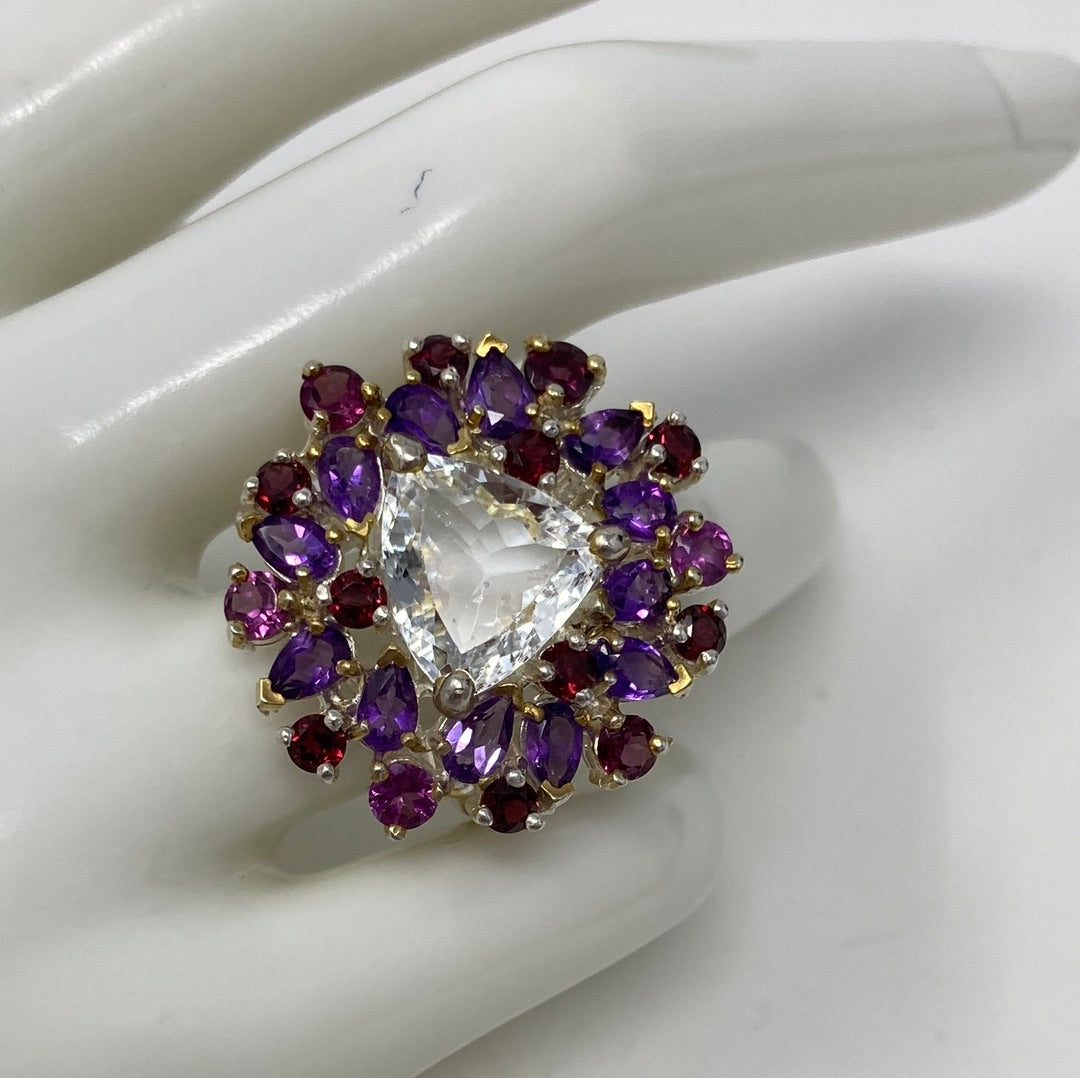 A rate find to find this high quality Genuine Aquamarine, it has everything, cut, color and clarity. The restful, calming watery blue that only a true Aquamarine can manifest. Encrusted with Genuine Amethysts and Rhodolite Garnets. A masterpiece of genuine gemstones set in .925 Sterling Silver. Notice the exquisite detailing in this custom made, one of a kind ring. Size 9 1/2, Resize at your jeweler or use a ring guard