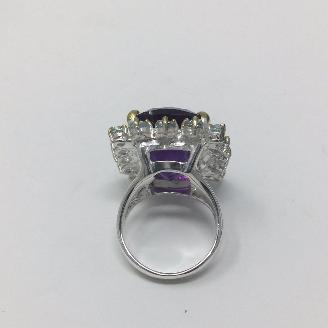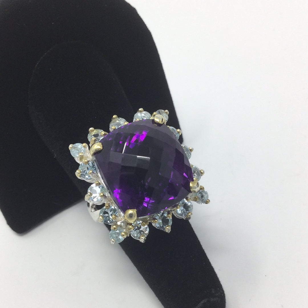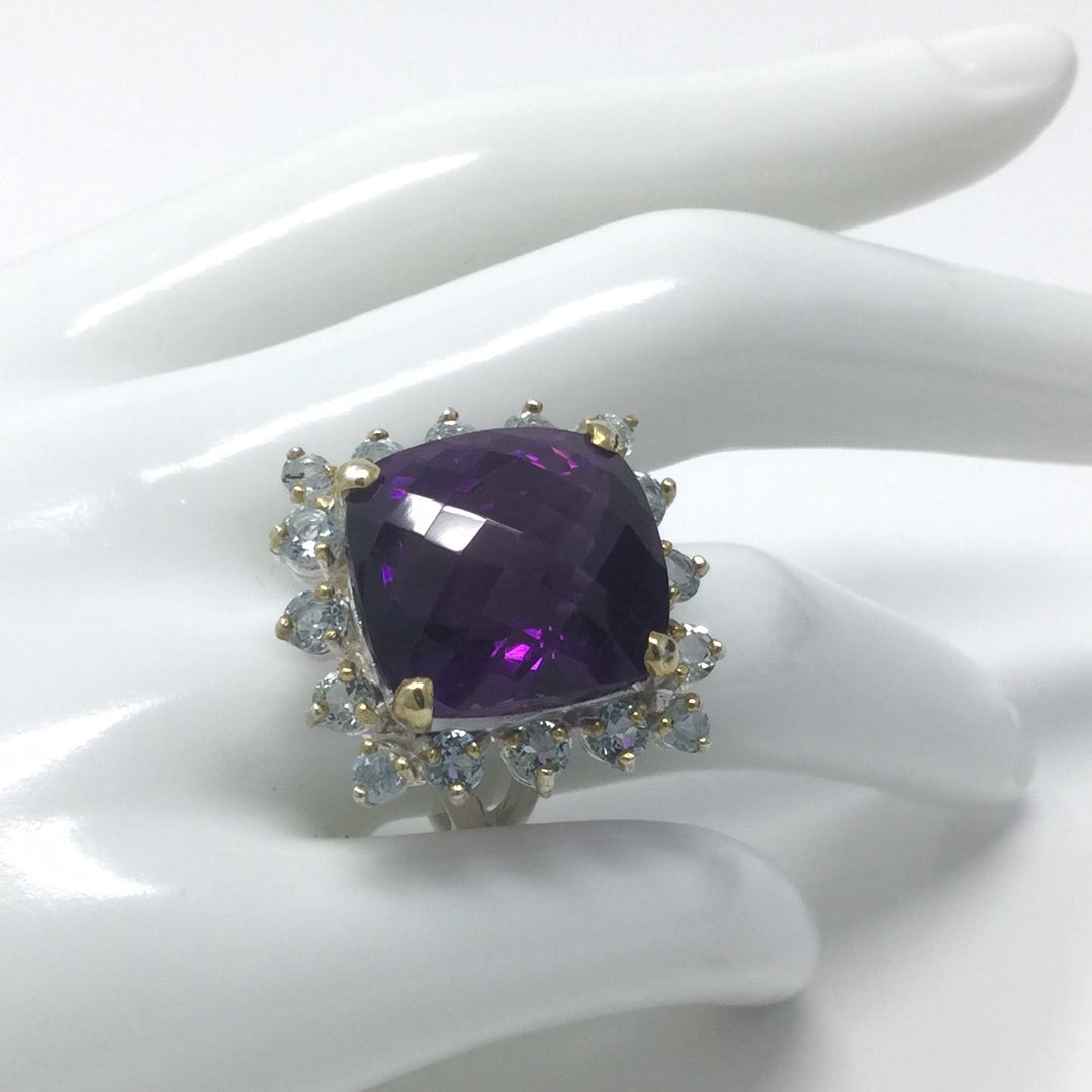 The checkerboard faceting is such a unique look and especially in this AAA+ Genuine Amethyst surrounded in genuine Blue Topaz. This gemstone measures in at 18mm by 16mm in is a spectacular gemstone specimen and are highly sought after. Set in .925 sterling silver with yellow gold prongs this is a one of a kind, custom made ring for those with elevated taste. It is a special piece for your heirloom collection. The cushion cut requires a large gemstone to work with to achieve this amazing look. Size 7, Resize at your jeweler.