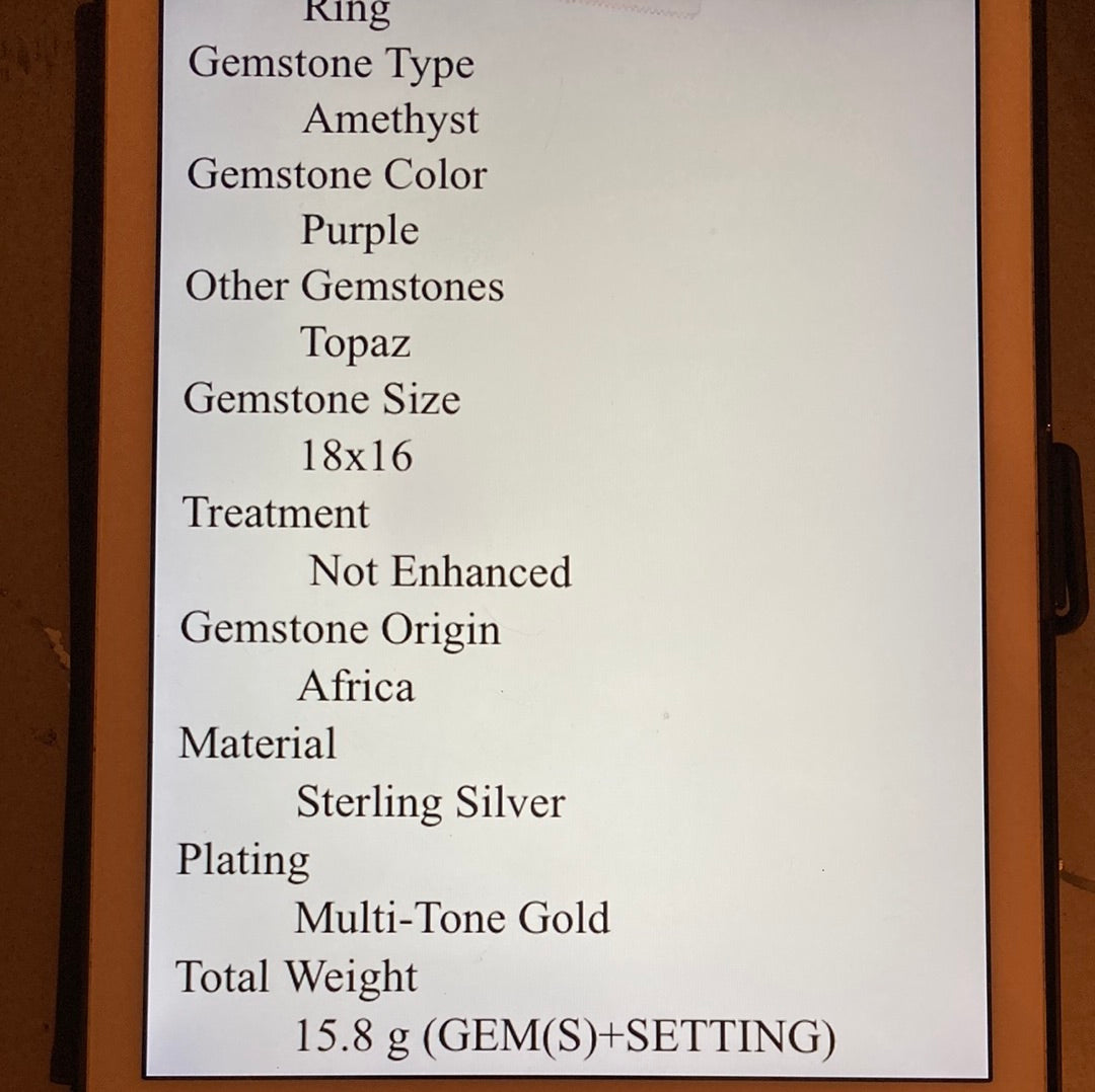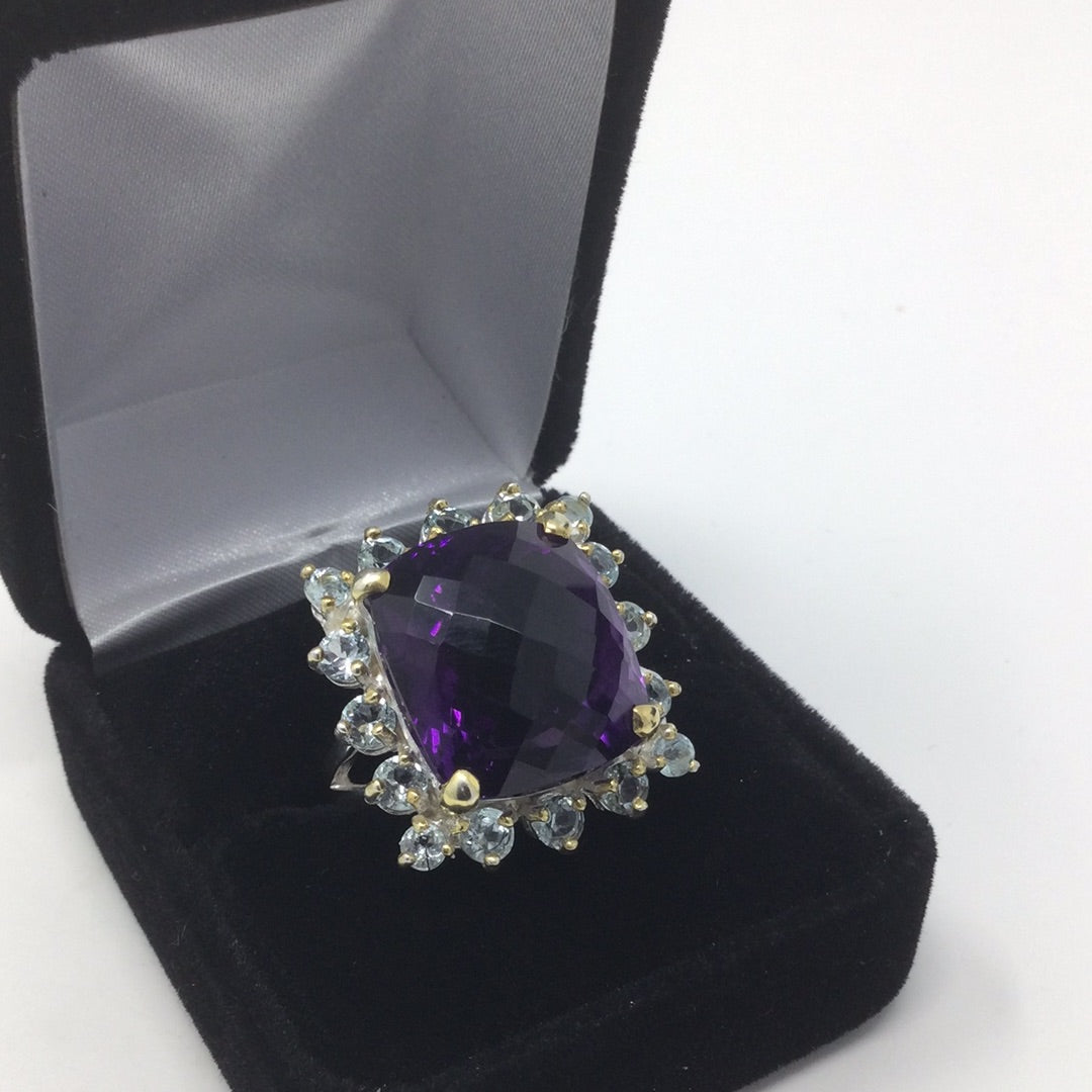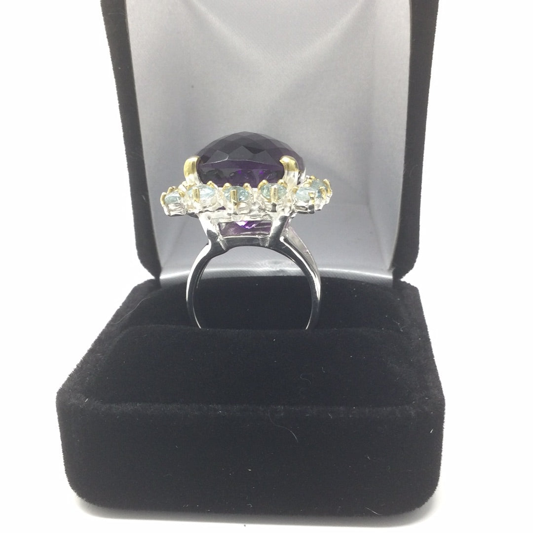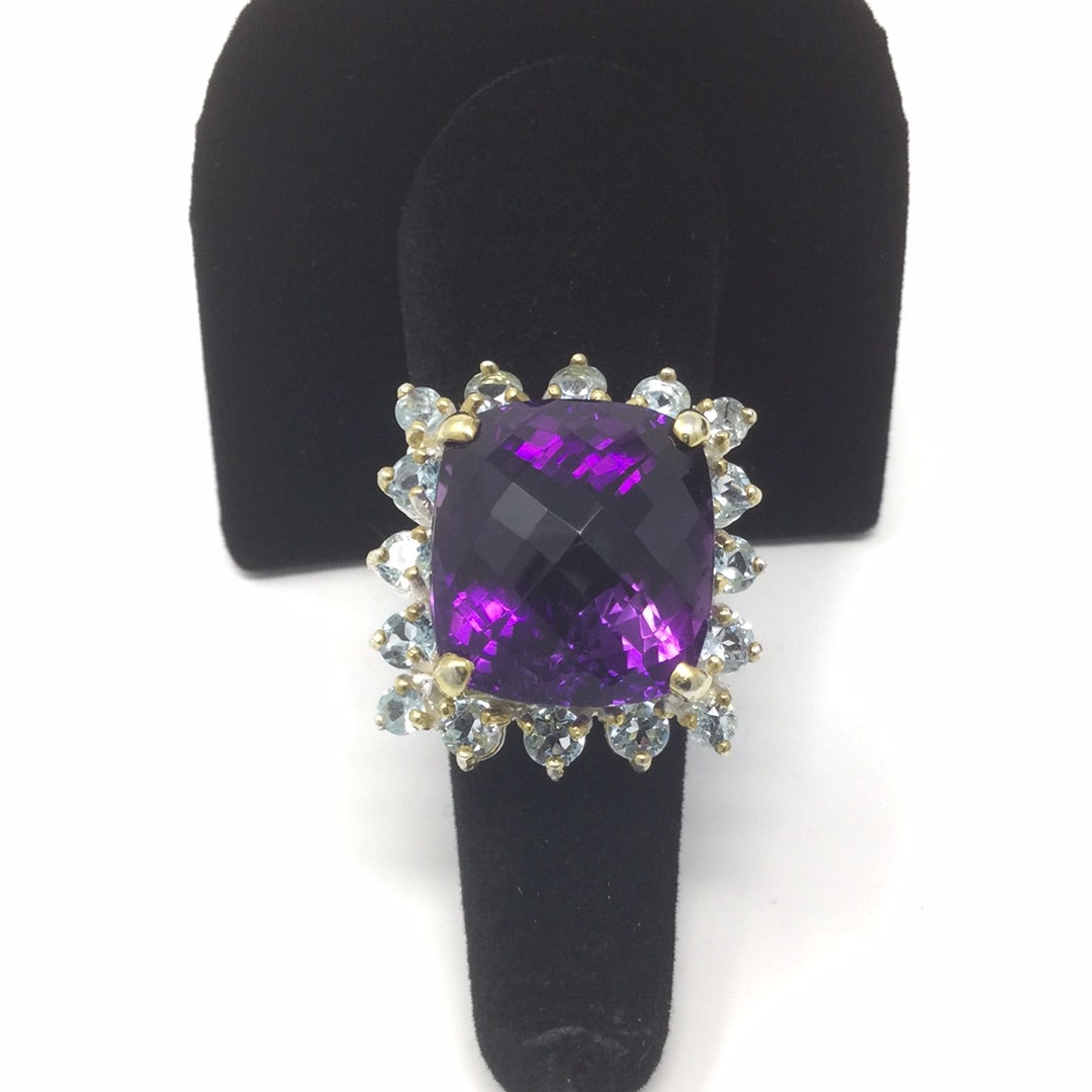 The checkerboard faceting is such a unique look and especially in this AAA+ Genuine Amethyst surrounded in genuine Blue Topaz. This gemstone measures in at 18mm by 16mm in is a spectacular gemstone specimen and are highly sought after. Set in .925 sterling silver with yellow gold prongs this is a one of a kind, custom made ring for those with elevated taste. It is a special piece for your heirloom collection. The cushion cut requires a large gemstone to work with to achieve this amazing look. Size 7, Resize at your jeweler.