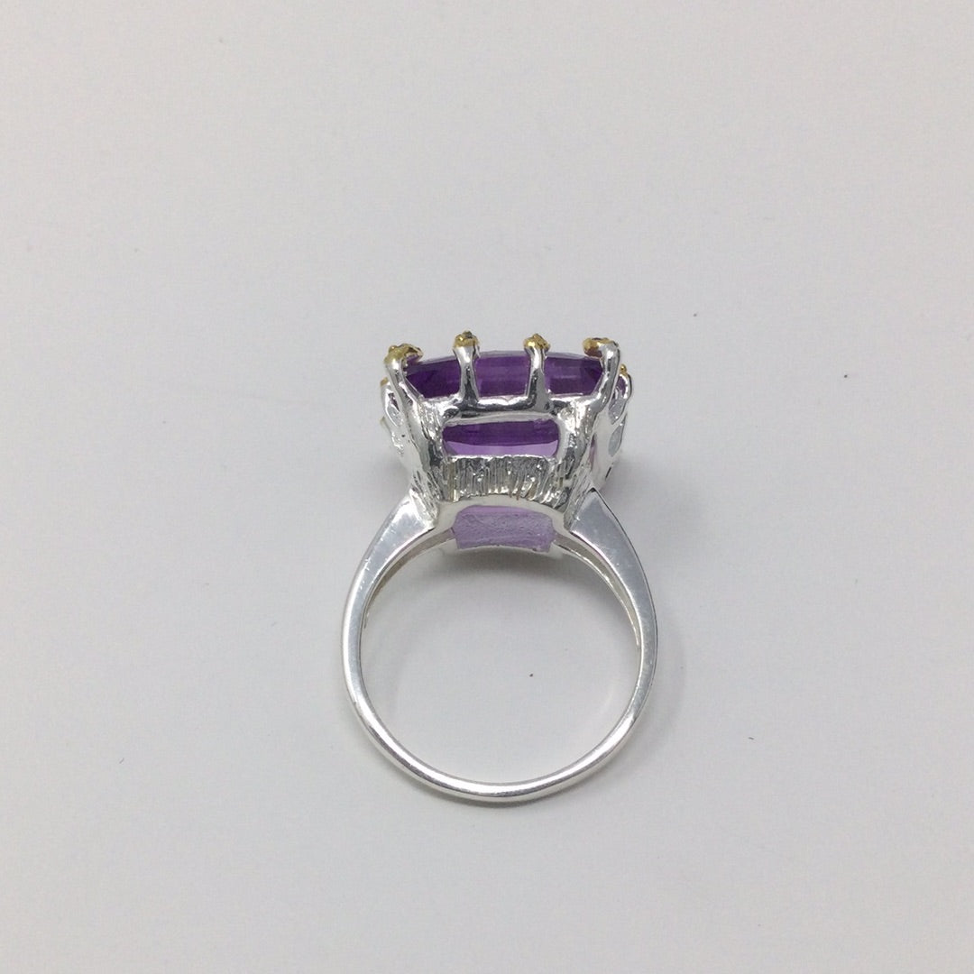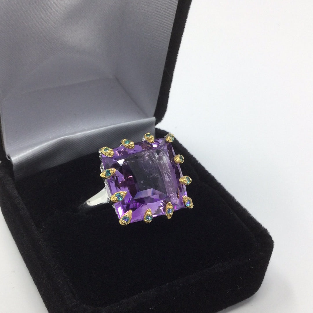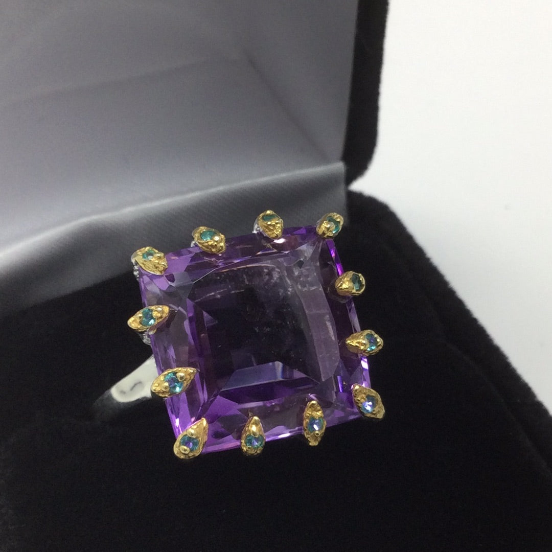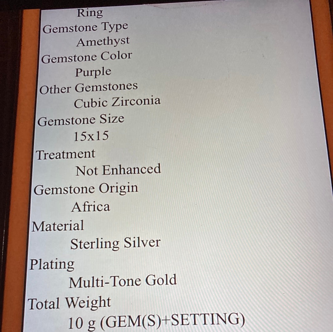 Seldom do we see a gorgeous faceted square cut 15+ CTW genuine Amethyst ring. It has a signature style as unique as you are. It sits majestic in its .925 sterling setting with a 14K white gold overlay. Accented with tiny CZ’s to showcase your magnificent genuine Amethyst. Size 9, can be resized at your jeweler.