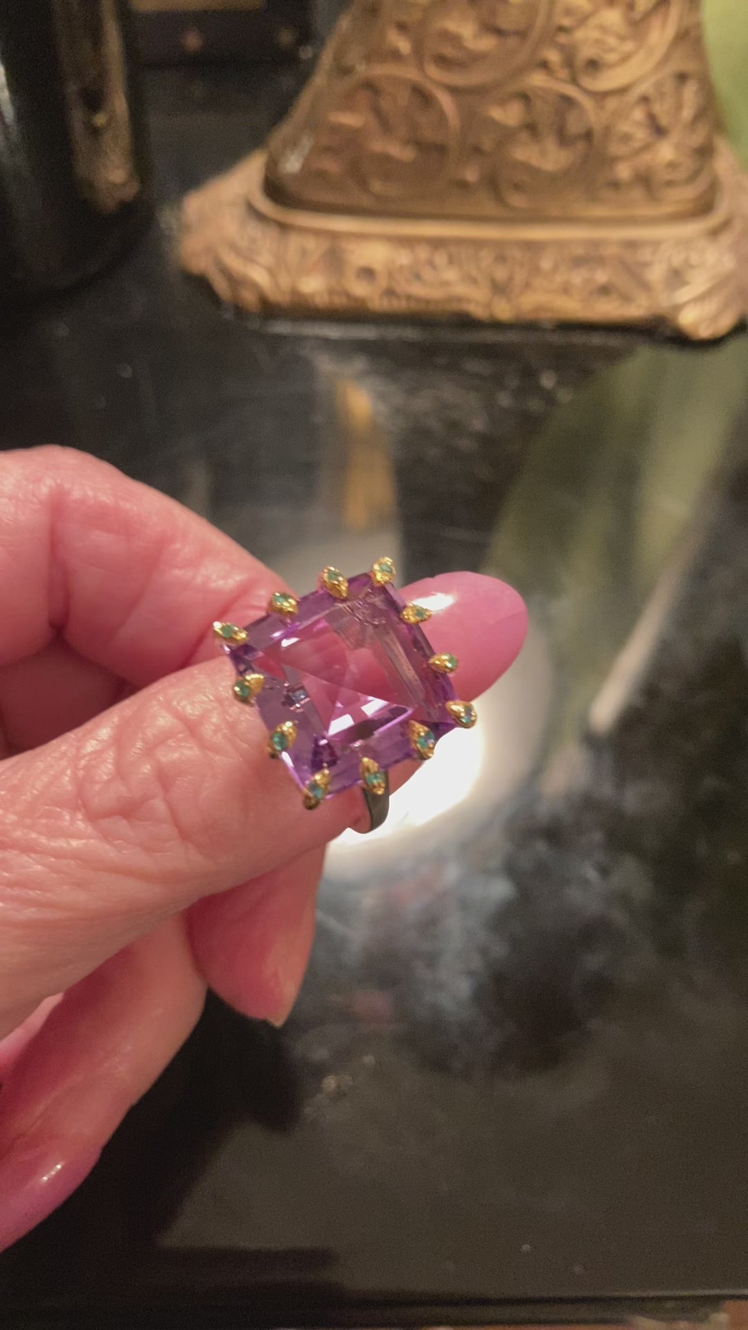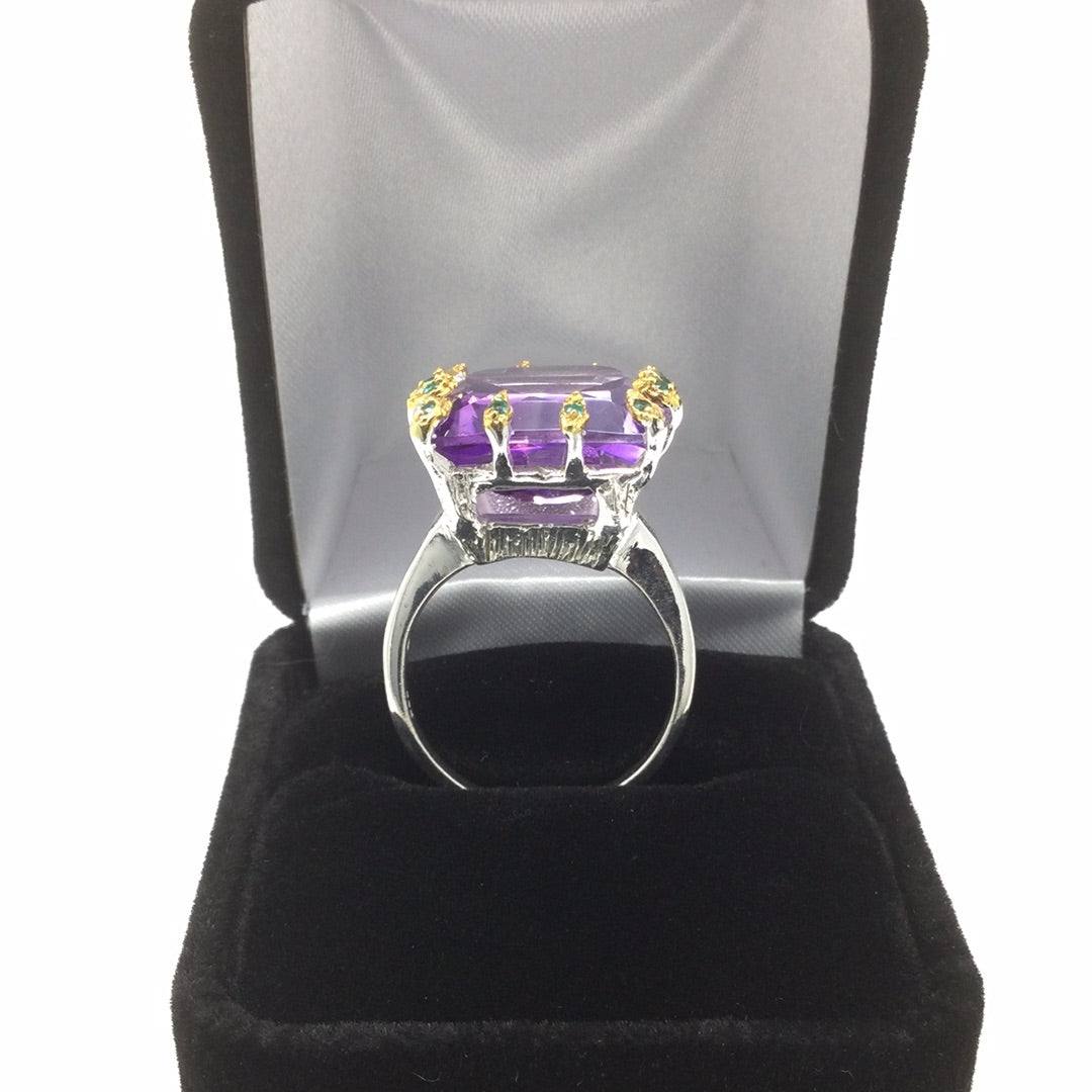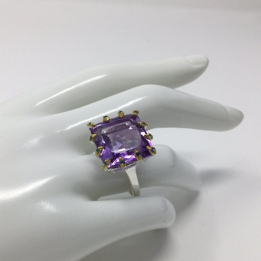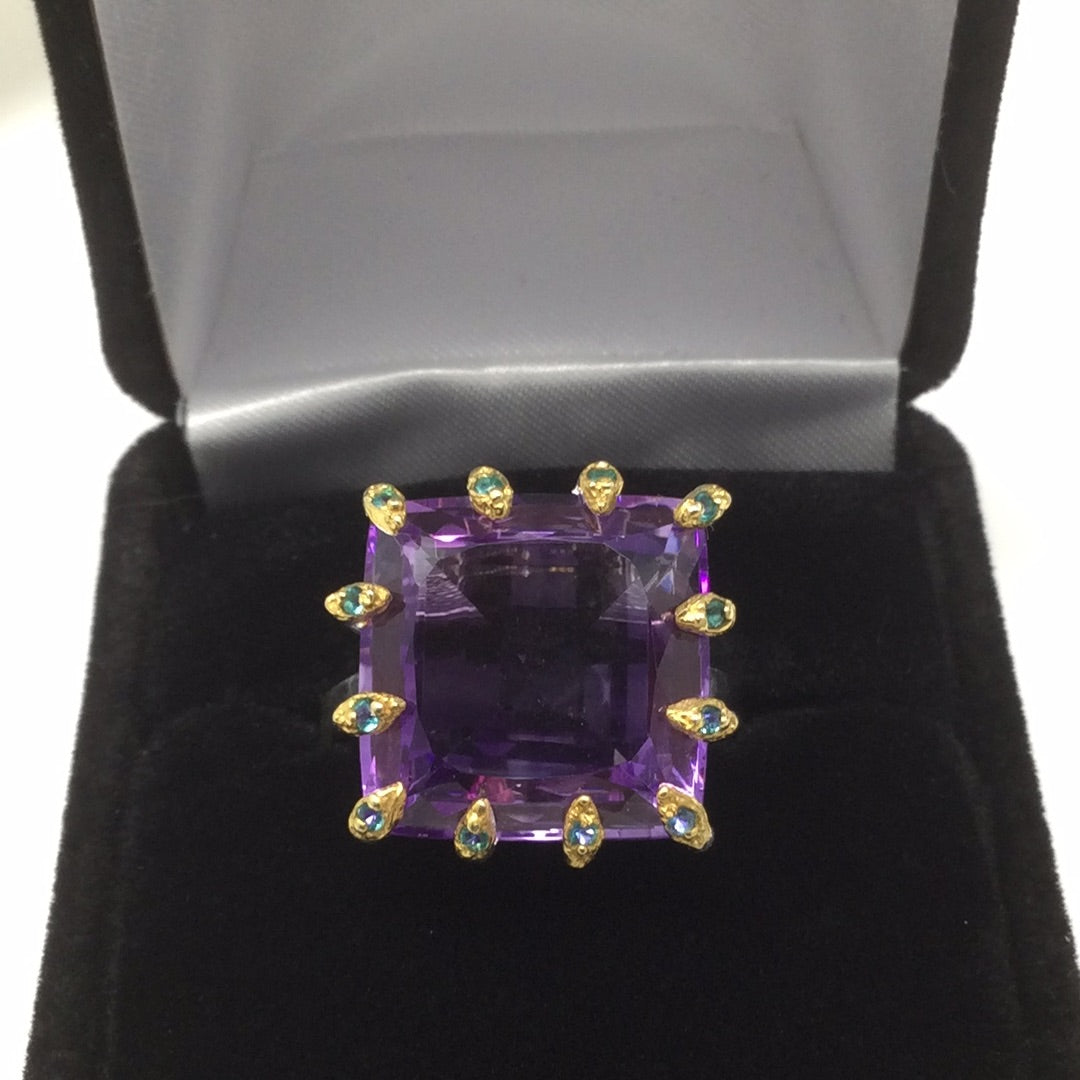 Seldom do we see a gorgeous faceted square cut 15+ CTW genuine Amethyst ring. It has a signature style as unique as you are. It sits majestic in its .925 sterling setting with a 14K white gold overlay. Accented with tiny CZ’s to showcase your magnificent genuine Amethyst. Size 9, can be resized at your jeweler.