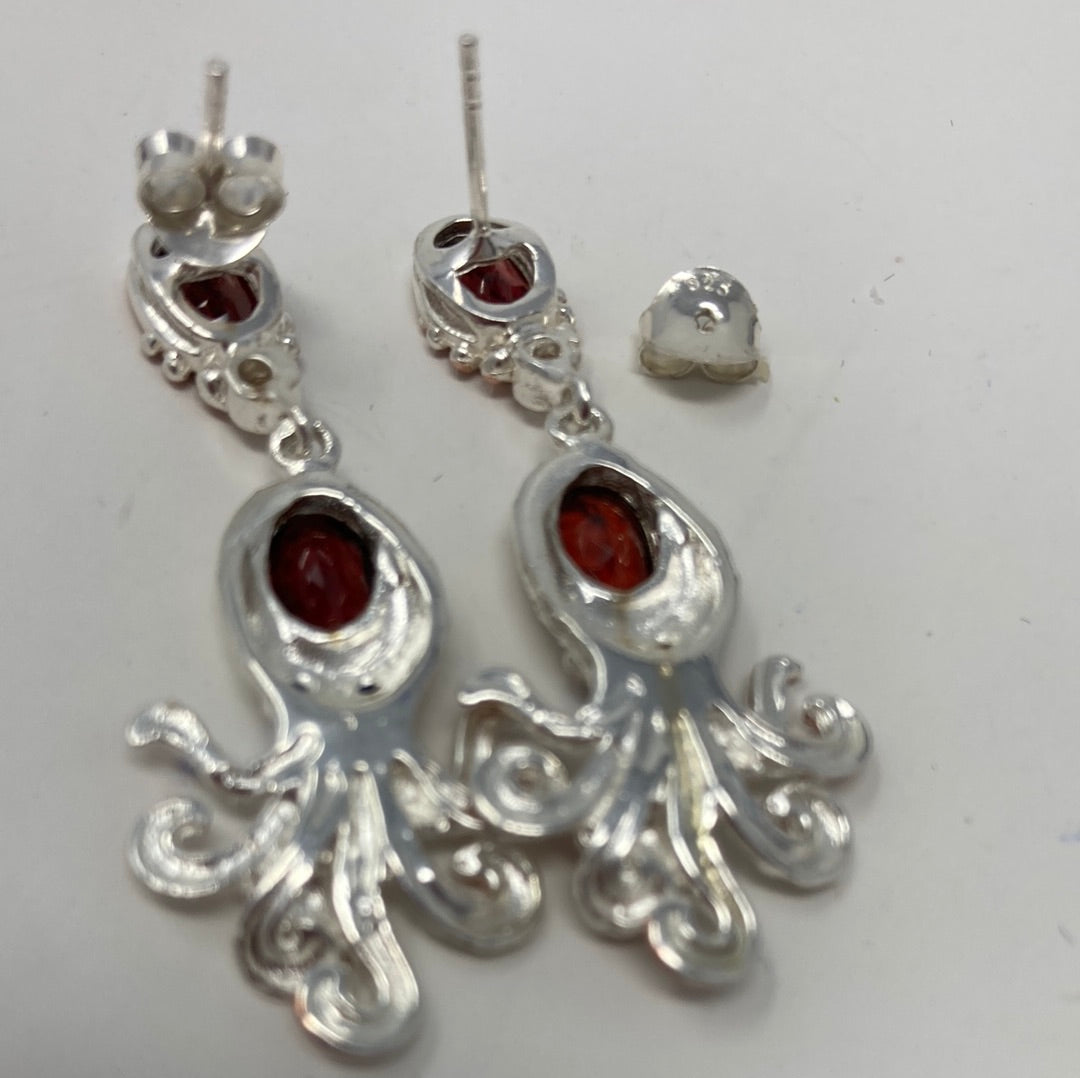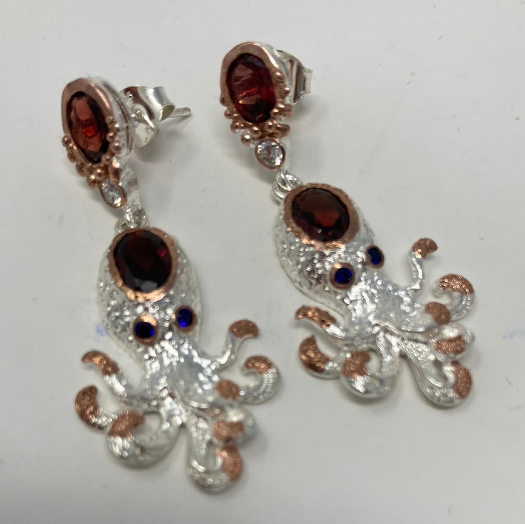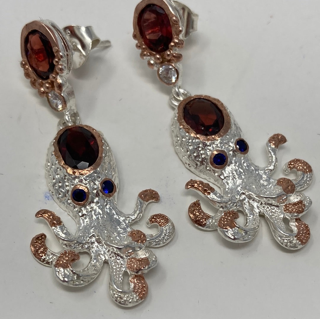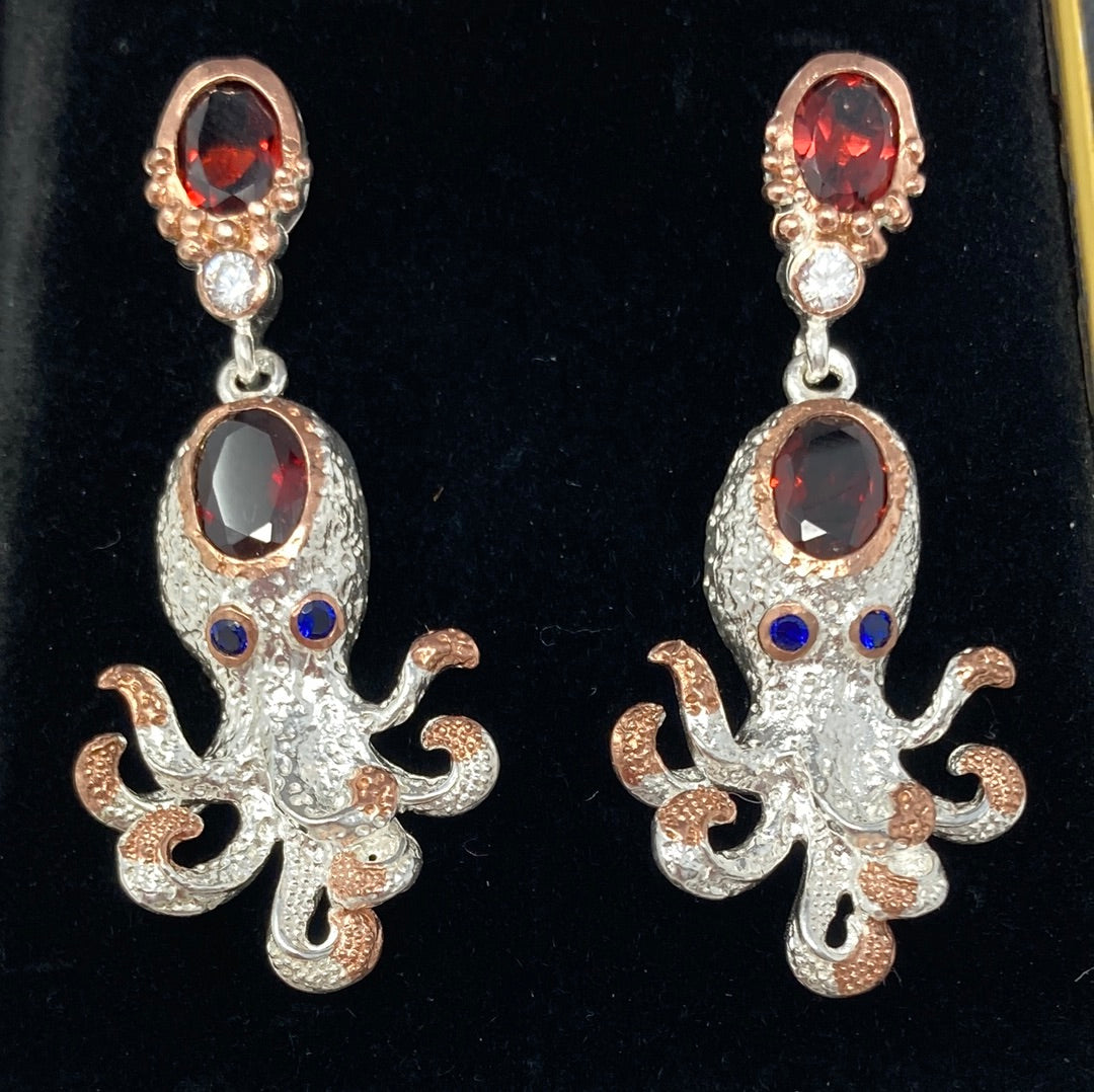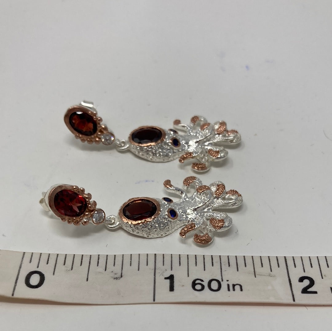 Super sweet, genuine Garnets inset into these adorable Octopuses. All crafted in .925 sterling silver with amazing attention to details. Hi quality Mozambique Garnets inset into this intricately detailed octopus with a white and rose gold overlay. They dangle approximately one inch long, a custom crafted design.